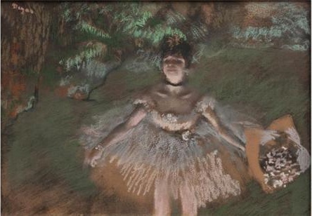 在德加1898年的作品《长椅上的女舞者》(Dancers on a Bench)中,他描绘出了芭蕾舞者在休息时调整足尖鞋的情景:其中的一名芭蕾女伶坐在长椅上,左腿支起。右手扇着扇子,左手抓着脚踝。不仅如此,德加则更加仔细地将这位芭蕾女伶的胸型刻画了出来。而在收藏于布瑞尔珍藏馆的作品《浴后擦拭身体的女人》(After the Bath, Woman Drying Herself)中,德加以一种极为奇妙而扎实的手法刻画出了画中女子湿漉漉的长发和光裸的后背。