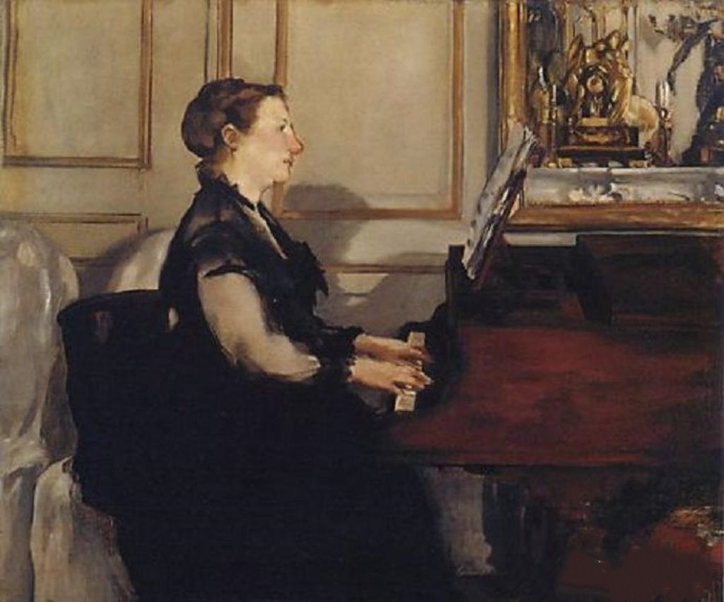 这位正在弹钢琴的富态而优雅的女人,是马奈夫人苏珊娜。1849年她19岁时从荷兰来到马奈家当家庭教师,给马奈的弟弟们上钢琴课。她虽然比马奈大两岁,但在亲朋好友眼里,苏珊娜既美丽又善良,而且很有艺术素养,如此多的优点集中在她身上让她显得分外特别。她时而在走道上弹钢琴,时而和猫咪嬉戏。马奈被她深深吸引,19岁那年两人坠入爱河。历经漫长的等待,1863年,33岁的苏珊娜和31岁的马奈终于在巴黎举行婚礼成为名正言顺的夫妻。马奈夫人弹琴很有魅力,据说法国十九世纪最著名的现代派诗人、《恶之花》作者波德莱尔临终前指定要听马奈夫人弹一曲钢琴。