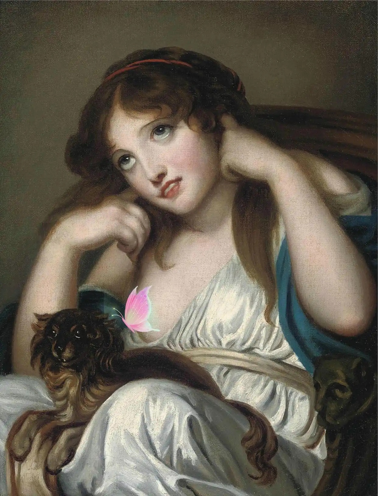 在这幅《堵住耳朵的少女》中,我们看到一个充满童真和幻想的画面。少女用双手轻轻捂住耳朵,仿佛在躲避某种声音,又似乎在独享一刻内心的静谧。她的目光向上倾斜,流露出一丝顽皮和好奇。她的身旁是一只忠实的小狗,为画面增添了几分温暖与趣味。