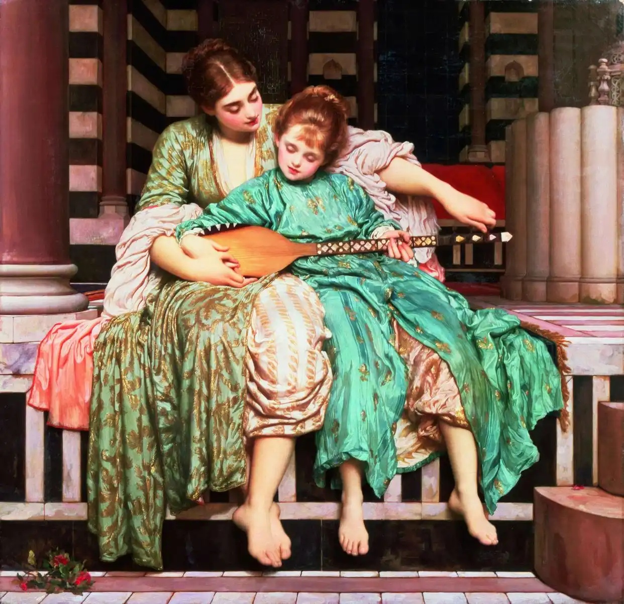 《音乐课》是英国学院派画家弗雷德里克·莱顿的一幅布面油画作品,创作于1877年。这幅画以两位女性在长椅上弹奏吉他的形象为主题,似乎是母女二人或者是老师与学生在教授吉他弹奏的音乐课,展现了她们优雅的姿态和音乐的魅力。画面的尺寸为2783x2550px,以**细腻的画质呈现出了这一场景的细节和色彩。
