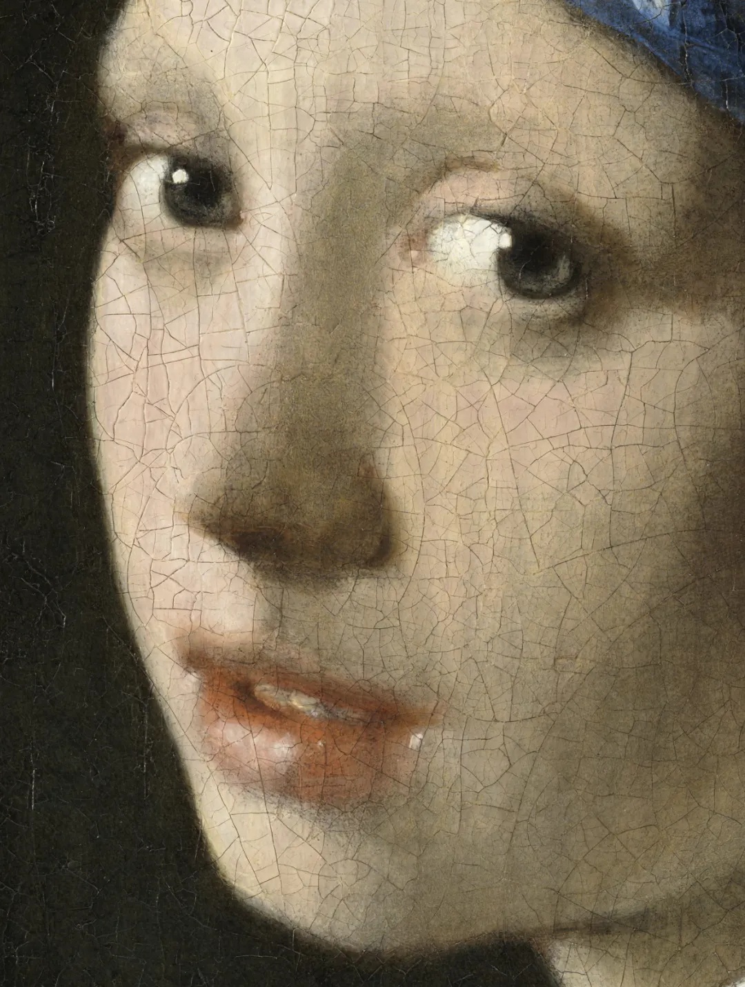画中的女孩儿显露了四分之三的脸庞,在充足的光线下,有着非比寻常的美丽:微开的双唇、水汪汪的眼睛、修长直挺的鼻子,是那样的惹人注目。她眼带笑意注视着观画者。