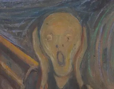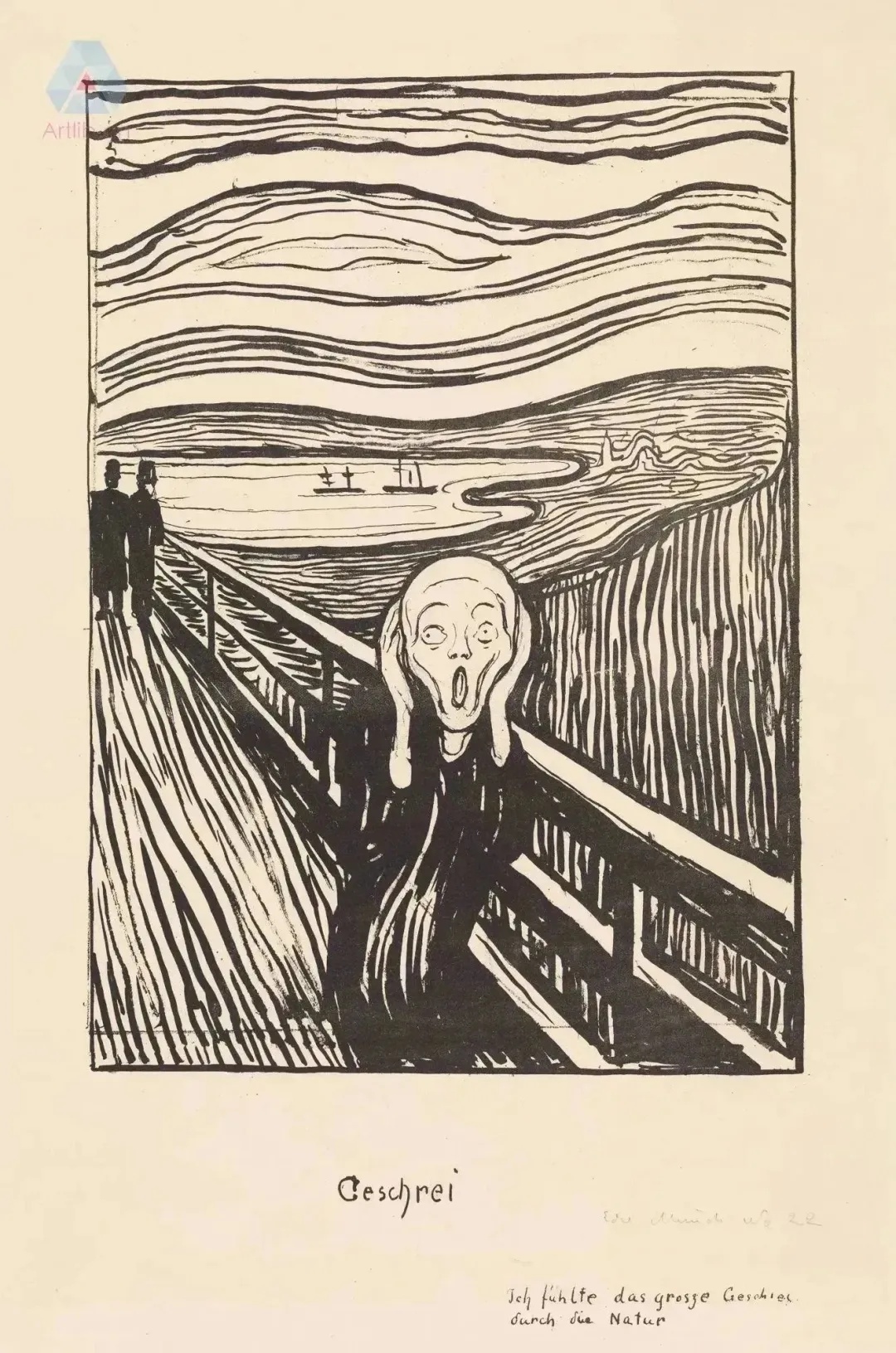 蒙克的代表作《呐喊》是将童年时期家人的相继死亡随之带来的痛苦、悲伤。焦虑、紧张、孤独,犹如火山喷发一样宣泄出来:一座绵延至远方的桥将画面分成两个部分,湍急的漩涡与血红色的天空各占一半。天空被描绘成翻滚的血色巨浪,画面主人公脸部扭曲如一具骷髅,并捂住耳朵发出了令人惊悚的呐喊,背景中有两个被可以拉长的人物,其身份的不确定性,增添了画面的诡异性。这幅画是蒙克在情感状态不稳定的状态下创作的,折射出作者内心的焦虑和潜意识里的精神问题。