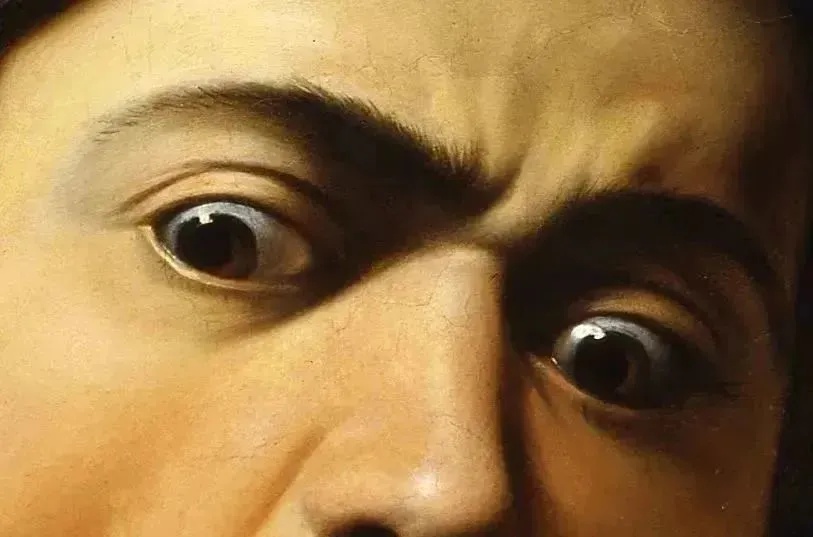 这幅画描绘了有着令人毛骨悚然恐怖表情的美杜莎的头,眼神中充满了恐惧。