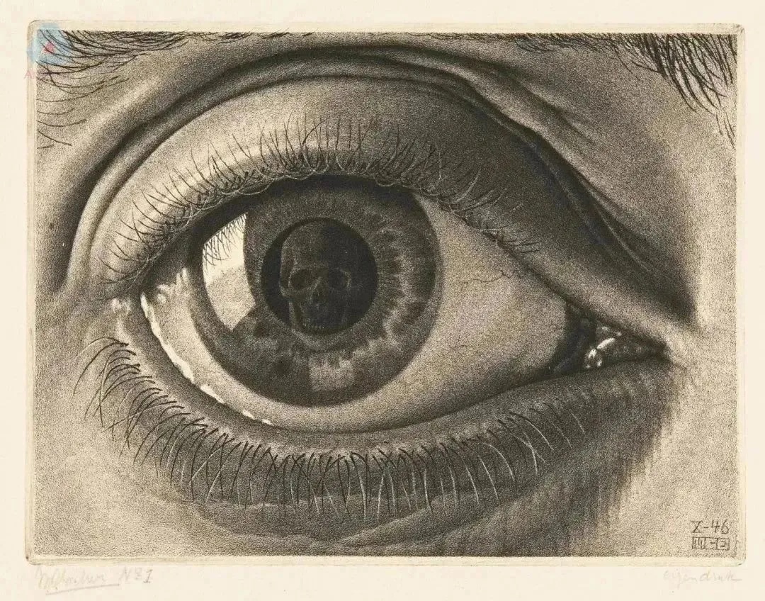 画家描绘了一个巨大的右眼,正看向画外,观者可以从画中的眼睛看到一个骷髅头——死亡的象征。给人一眼就看到死亡的恐惧感。有趣的是,观者既可以将眼睛中的骷髅头看成他人,也可以看成自己,就如同看X光片一般。
