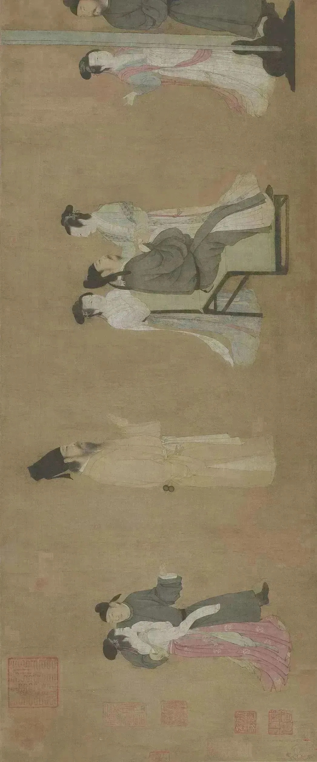 面向观者的两位仕女眼神对视,好似在交谈。画中仕女体态匀称优美,削肩狭背,柳眉樱髻,额、鼻、颇施以“三白”,既吸收了张萱、周昉创造的“唐妆”仕女造型特色,又体现出明代追求清秀娟美的审美风尚。四人交错而立,平稳有序,并通过微倾的头部、略弯的立姿和攀连的手臂,形成动态的多样变化和相互的紧密联系,加强了形象的丰富性和生动感。