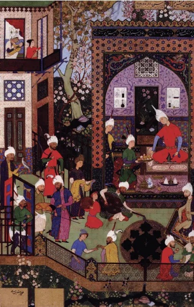 藏于大英图书馆的细密画《胡马和胡马雍花园宴饮赏乐图》中,三个白地蓝花花瓶被绘制在这一热闹的花园聚会情境中,从其色彩、纹样与形制等的特点来看,与东方青花瓷器极为相似。
