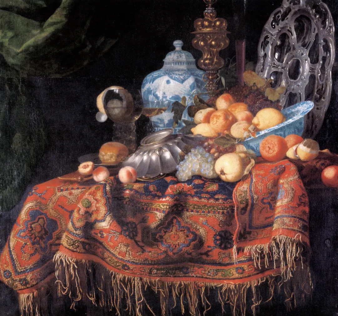 威廉·卡尔夫是荷兰黄金时代杰出的静物画家。他的许多作品属于奢华静物画,着重表现各种材质的华丽器皿。 画中的青花盖碗可能用作糖罐,这件盖碗和地毯无疑是东方舶来品,玻璃杯和银盘价值不菲,就连柠檬和酸橙在当时也是带有异域色彩的奢侈水果。许多17世纪中叶的静物画都呈现这样的组合,似乎再现了富人宅第的一隅,这类作品在荷兰风靡一时。