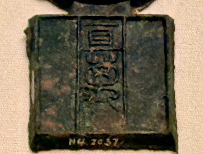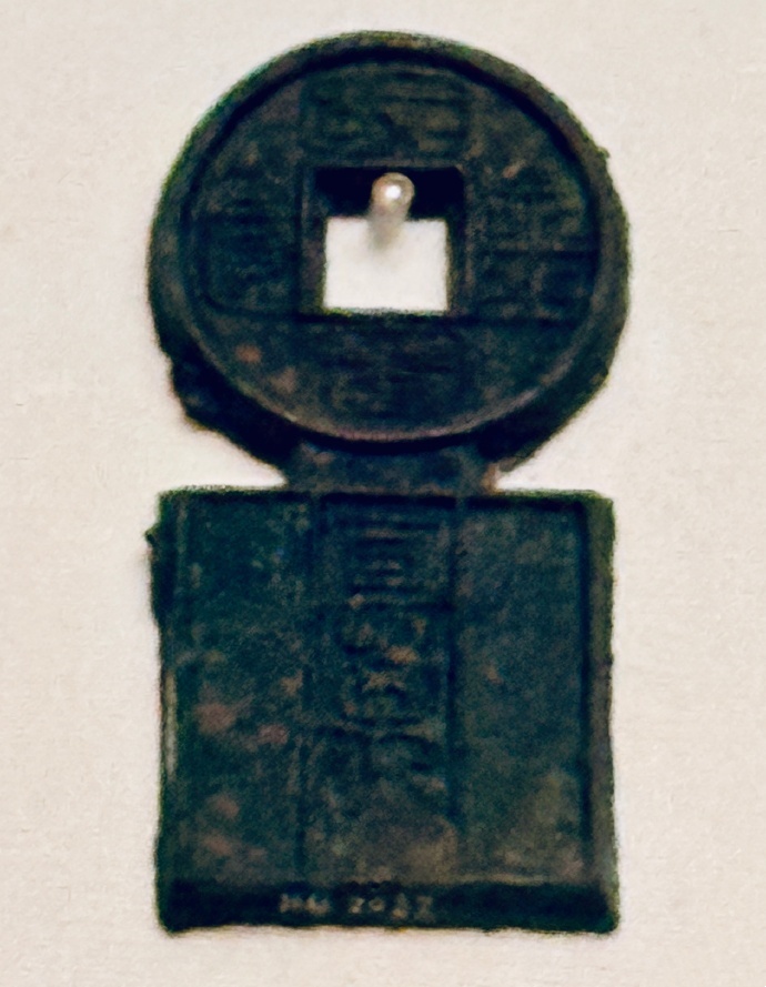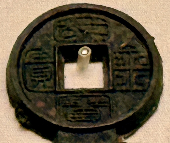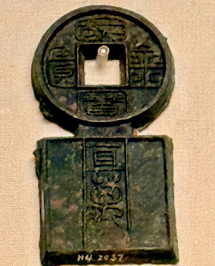 汉王莽新朝. “国宝金匮直万”青铜钱——“国宝金匮直万”青铜钱为传世品,现收藏于中国国家博物馆。此钱上半部为方孔圆形,铸“国宝金匮”四字,下半部为正方体,铸“直万”二字。钱缘流铜参差不齐,显然出型后尚未经过打磨加工,可能未正式流通,所以仅在今天的陕西西安叉城一带出土过数枚。汉代黄金每斤值万钱,所以此钱可代表黄金一斤,即与一枚金饼等值。王葬时期金禁甚严,自列侯至庶人均不得携带黄金,铸此钱的目的也可能是用以代替金饼。“国宝金匮直万”青铜钱为“古泉五十名珍”之一。