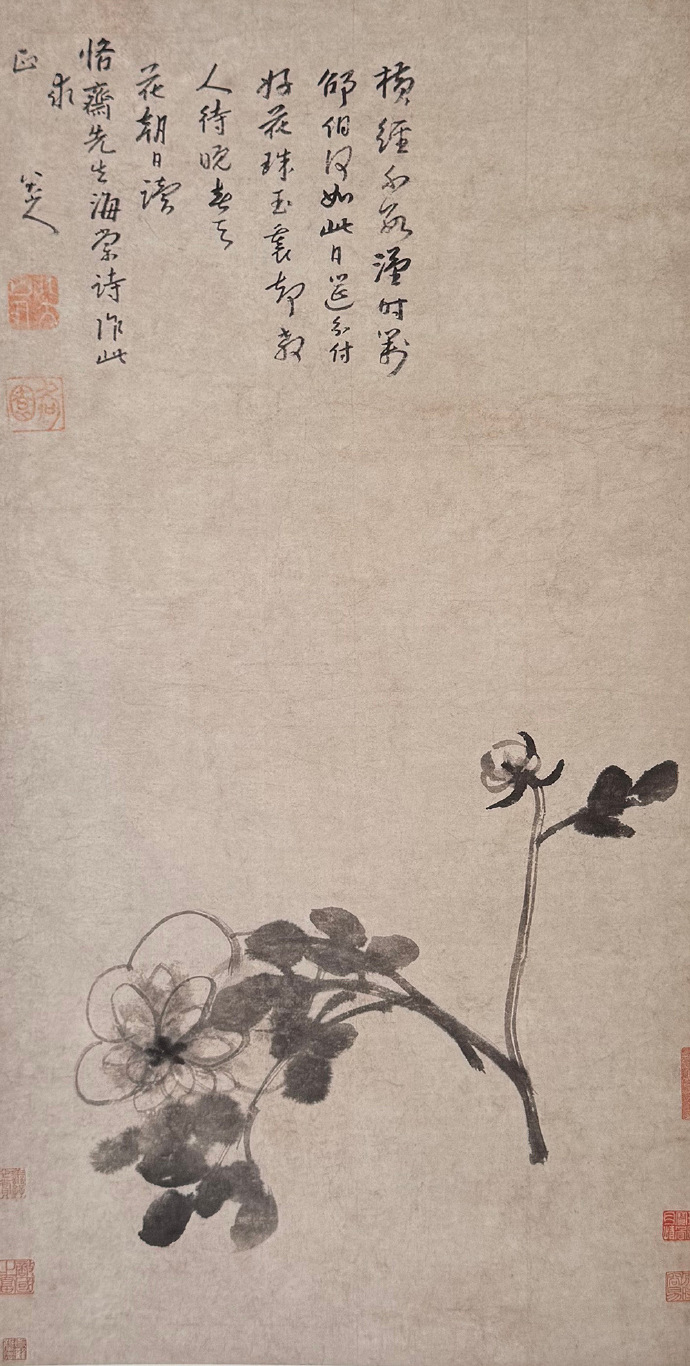 《芍药图》乃清初画僧八大山人之作。画中芍药仅一花、一苞与数枚叶片,笔墨简练至极。芍药花苞尚小,挺立向上延伸;盛放的硕大花朵横斜向下,花叶堆叠交织,构图富于变化。芍药花瓣圆润饱满,花心处以淡墨晕染。虽是盛放之花,却别具一种清寂的禅意。画上另有题画诗一首,意涵丰富。诗文、书法与画作相得益彰,尽显八大山人笔墨疏简但神清气足的艺术风格。