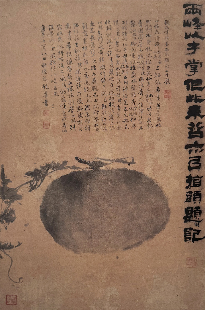 《西瓜图》是清代名家罗聘的别致之作。画中西瓜以手绘成,通过墨色的深浅变化和线面交织,刻画出藤蔓、叶片等细节,表现出瓜身饱满水润、瓜蒂劲健粗壮、瓜藤柔韧连绵的特点,极富“笔墨”意趣。画中另有桂馥以手指写就的隶书题记,以及钱载抄录的罗聘与多位友人的咏画联句。全图既是诗书画结合的典范,亦是清代文人间诗画酬唱的佳作。