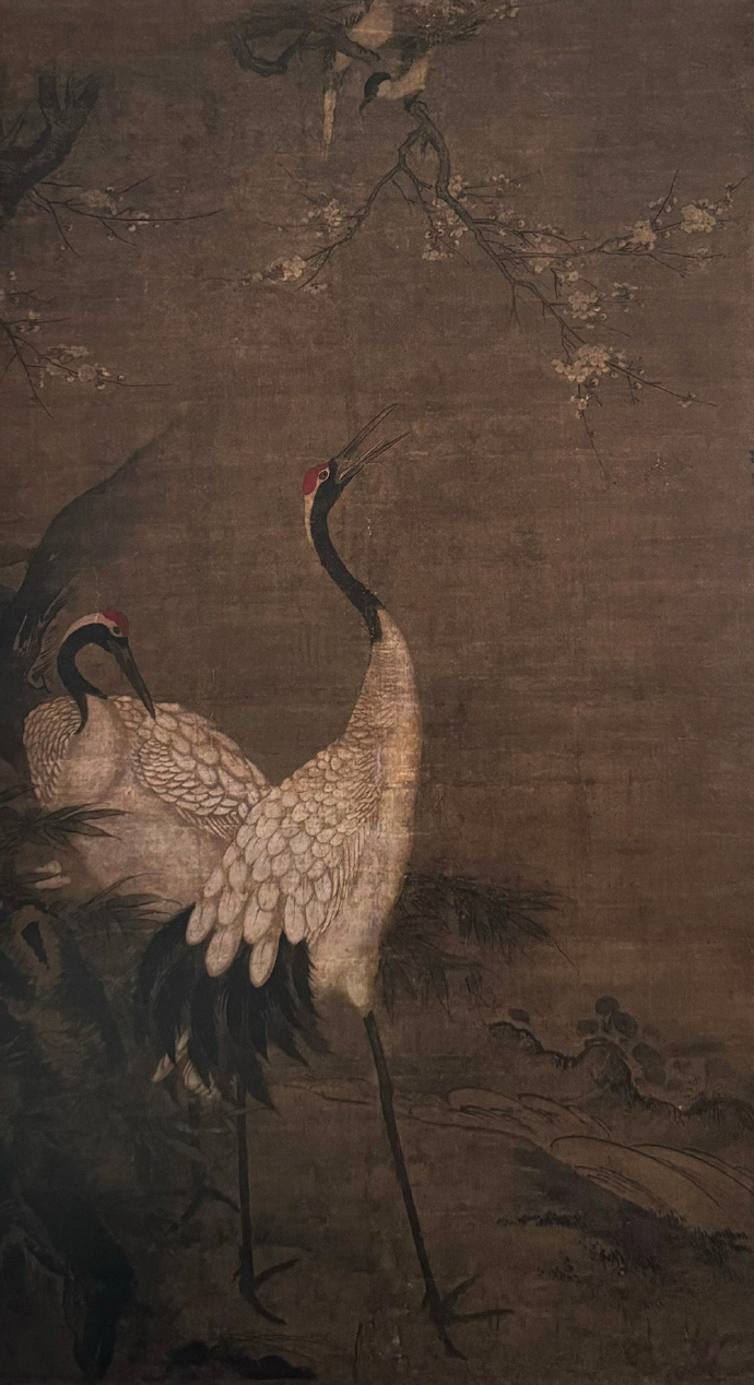 《双鹤图》是一幅以白鹤、寒梅和翠竹为主要表现对象的画作。画中两只白鹤伫立在古梅之下,一只曲颈回首,悠然闲适;另一只脖颈长伸,昂首鸣叫。循声而望,可见梅树枝头停着两只俯身下看的灰喜鹊,它们与双鹤构成了互动关系,也赋予整个画面以活泼生趣。传统花鸟画中有“梅鹤双清”“竹鹤双清”的意象,文人画家常借此表达明洁之志。本图既是这一传统下的佳作,也蕴含着画家本人对自然与生命的哲思。