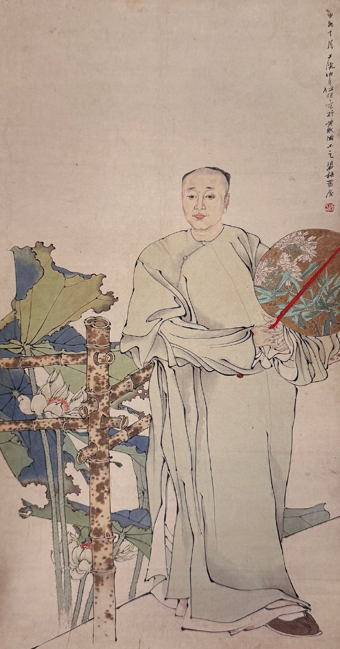 《凭栏赏荷图》乃“海上画派”名家任颐早年的人物画作品。画中人物手握扇柄,凭栏赏荷。其身着淡青长衫,神情端凝平和。人物衣纹线条秀劲,面部勾绘尤为细致,鼻翼等处以淡墨皴染出光影明暗。斑竹制成的栏杆,古雅秀逸;荷花亭亭玉立,荷叶偃仰向背,各具姿态。全图笔法中西结合,生动描绘出了画中人物的风神气度,乃任颐肖像画中的佳作。