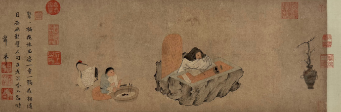《西湖吟趣图》是一幅描绘“梅妻鹤子”的林逋赏梅寻诗的作品。图中林逋长袍风帽,双手笼袖,伏案静思。他凝望着画面右侧的瓶梅,梅枝上疏花点点,清丽可人。左侧绘一童子抱膝坐在蒲团上,手脚一齐伸向面前的火盆取暖。童子身后,一只白鹤伏卧,回首张望,神态安然。卷末有诗跋一首,诗句与画面相得益彰,生动呈现了林逋闲散自得、出尘绝俗的隐逸清趣。