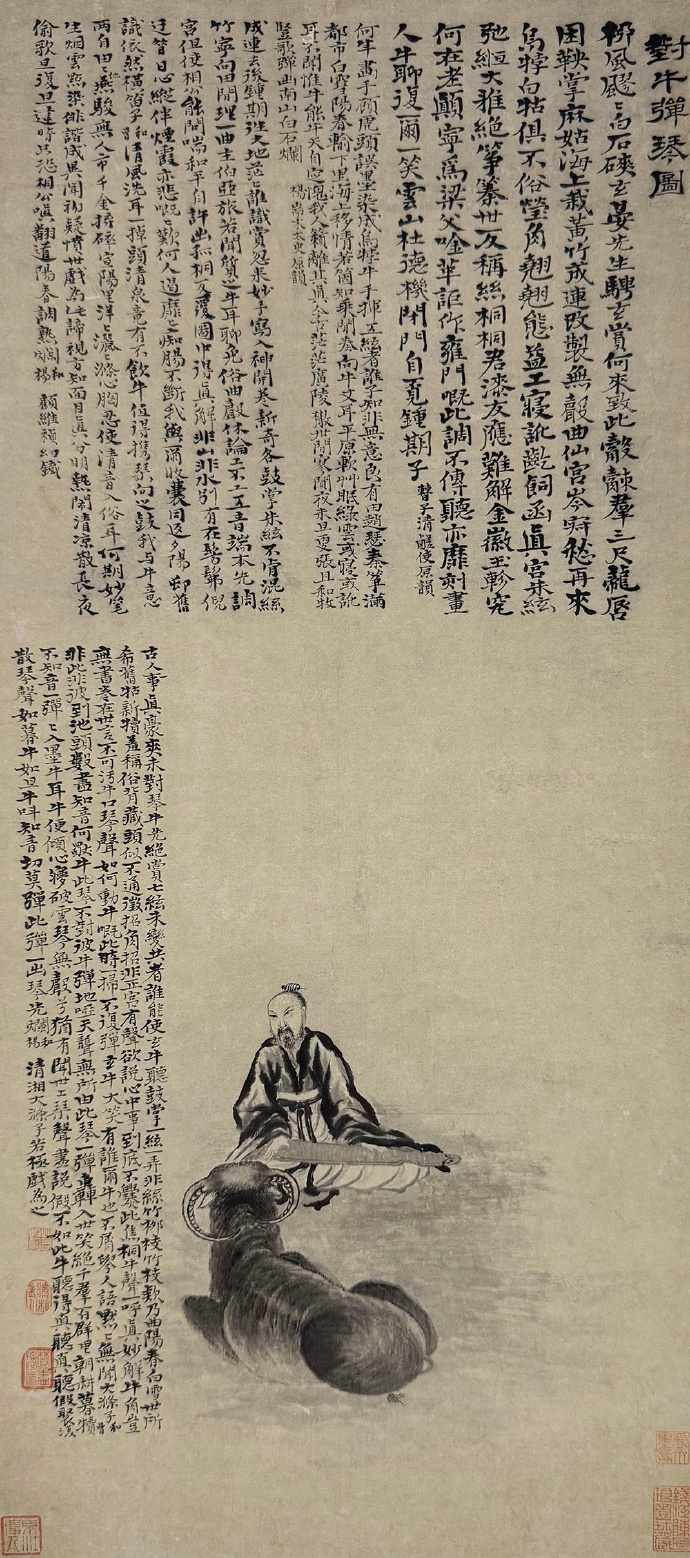 此画构图奇险,笔墨老到,意境突出,是石涛人物画杰作。“对牛弹琴”一词本是讥笑说话的人不看对象。但此图通过作者自题“世上琴声尽说假,不如此牛听得真”等诗句,反映出作者难遇知音,而只能寄托于“牛声一呼真妙解”,反映了作者孤独落寞的心境。