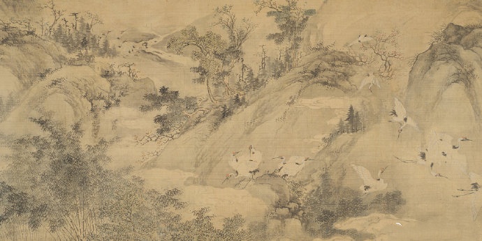 《百鹤图》描绘了百余只仙鹤栖息于灵山圣境与松柏寿桃之间,姿态各异,神韵生动,呈现出一派百鹤游嬉的祥和景象。画家以写实的笔触精细勾勒山石草木,仙鹤穿梭其间,与山林景致浑然一体。卷末有雍正、乾隆年间长于花卉翎毛创作的沈铨之款,但馆藏方认为其乃伪添,将本图定为佚名画家所绘。无论是否出自沈铨亲笔,本图都属于笔墨雅驯、格调清逸的佳作,寄托着人们对“松鹤长寿”的美好祈愿。