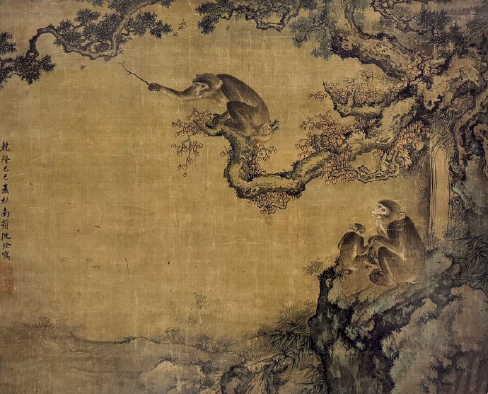 画作描绘猴与蜜蜂,是以“蜂猴”寓意“封侯”,为古人祈求官运亨通的常见绘画题材。画心左侧有署款“乾隆壬戌长夏,写易庆之笔意,南蘋沈铨”,并钤“沈铨”“衡斋”“石耕”印三方。壬戌为乾隆七年(1742年),易庆之即北宋画猿名家易元吉。