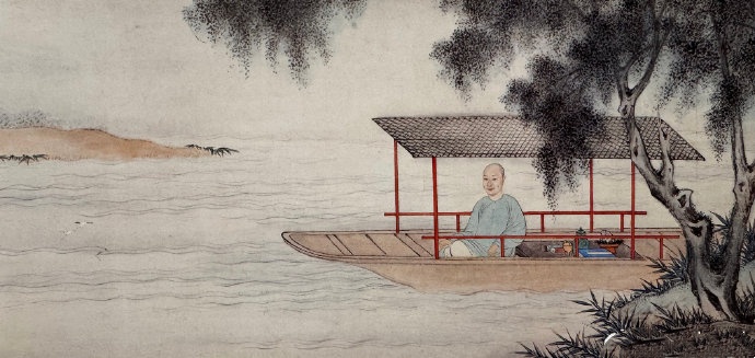潘恭寿,字慎夫,号莲巢,初无师承,后行以书入画之道,画艺日进,又得王宸(1720—1797)以“宿雨初收,晓烟未泮”八字真言之授,遂有文人气象,尤以古迹证仿,山水清腴妍冷,秀逸出尘;兼工写生没骨,濯濯如迎风凝露,而佛像人物则秀韵天成。他是乾隆、嘉庆年间肖像画大家,当时镇江地区名流小像多出其手。这里,他将像主布景于春柳吹拂、幽篁点翠、烟波浩渺间,张铉端坐于敞舸之中,面庞光洁,眉清目秀,修然自得,书卷、鼎壶、盆景诸器一应俱全,而童仆执橹静候,隐于柳荫坡岸,一派清幽之景。张铉脸部依照明末波臣画法,先以淡墨勾出轮廓,继以淡墨和淡赭按面部结构层层烘染渲晕,将五官形成凹凸立体的表现,眼珠点睛,形似逼真,而衣着则以线条勾勒造型,描摹出最动人的姿势,堪称肖像画佳作。