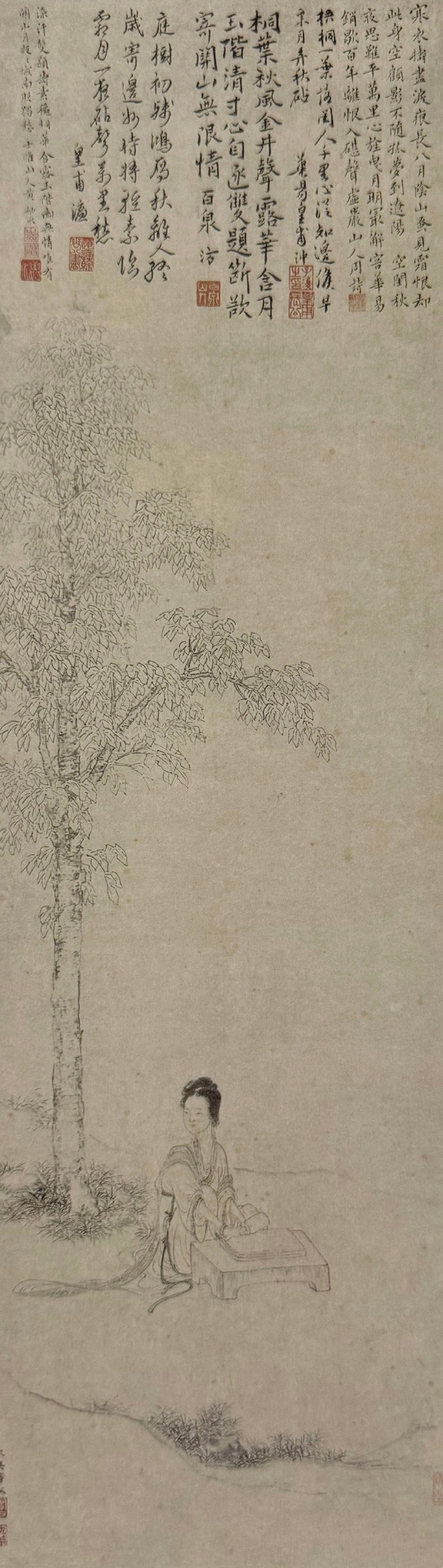 《捣衣图》描绘一位仕女在梧桐树下捣衣之态。梧桐树位于画幅左侧,树下秋草杂生,女子独自蹲坐于石砧前捣衣。她姿容秀丽却面带哀愁,好像在期盼离人归来。画面上部有后人诗跋,围绕画中意象勾勒了深闺思妇的形象。捣衣是古时文人诗画创作的重要主题,本图也属于这一创作传统,简练的构图和笔墨寄寓着丰富的情感与文化内涵。