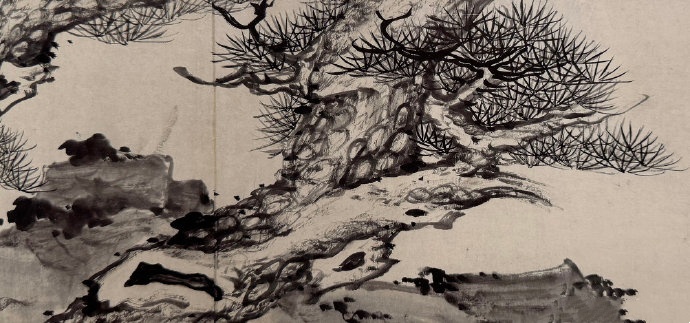 《梅松图》是弘仁所绘松石与梅枝两段画作的合装卷。前段描绘异松怪石,松树苍老遒劲,攲斜夭矫,针叶细密劲利;其下山石横卧,轮廓分明,峻峭凌厉。后段绘水墨梅花二枝,一枝方露头角,细枝上点缀花苞几朵;另一枝则老干斑驳,曲屈如铁,尽显刚毅风骨。画卷引首和拖尾处都有弘仁挚友的题诗,松梅并咏,彰显风骨韵致。