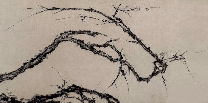 图绘水墨梅花。梅不畏严寒、高标独立的精神正是作者所追求的人生品格。弘仁一生最喜画梅,自号“梅花古衲”,创作出大量以梅为主题的佳作,此卷便是其中之一。图中的梅枝如曲铁,婉转中呈现刚毅不屈之态。其简约的格局,精谨的笔墨,结构出一派纯净、幽旷而又俊逸的意境。