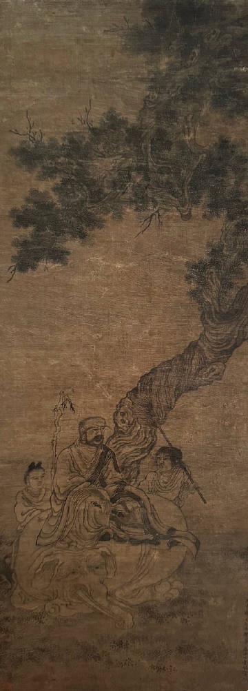 《驯象图》是一幅寄寓着多重含义的画作。图中,古柏盘曲虬结,其下一头大象蜷卧于草地之上,象背上端坐一罗汉,似乎是十八罗汉中的骑象罗汉。罗汉右侧的童子肩扛一柄扫帚,又提示出画面的另一重含义——扫象,即“扫相”,以破除对名相的执着。本图中仅有年款,没有题跋,但画面上丰富的内容及其象征意义,无不展现着道释画的精深宏富。