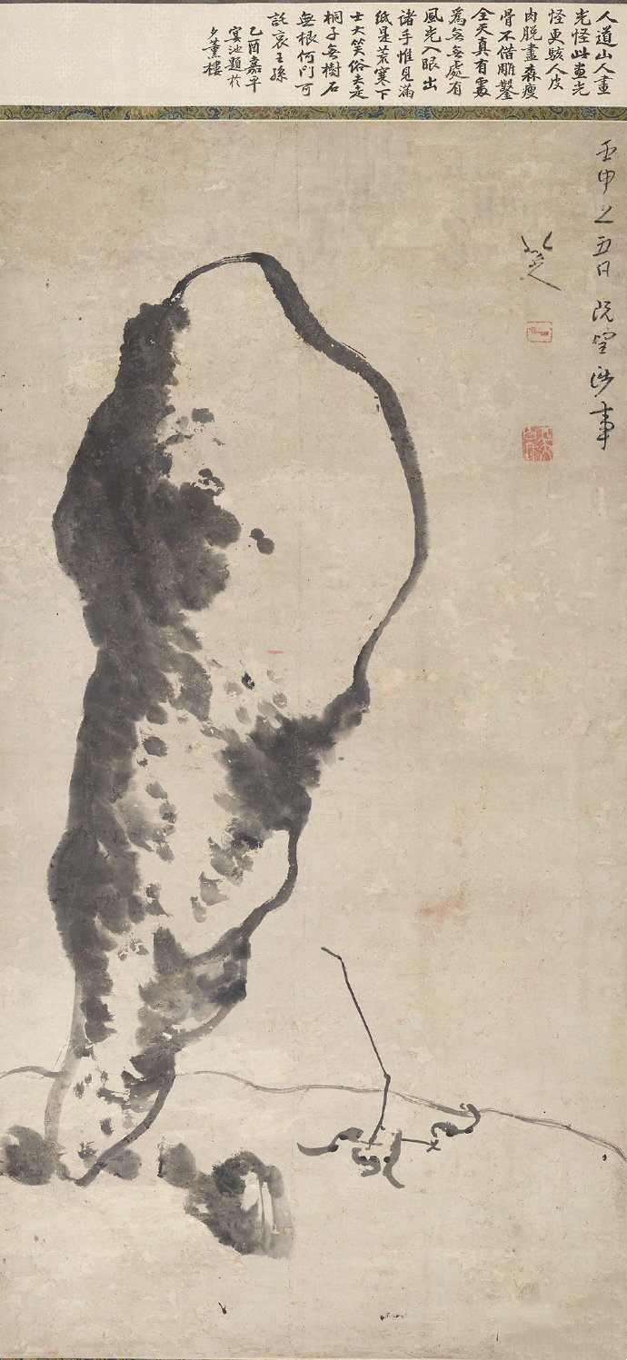 《石头桐子图》乃清代画僧八大山人之作。画中仅有一块奇石、一枝梧桐,布局简约却满含深意:奇石乃画家常绘的头重脚轻之态,且已倾斜,给人以大厦将倾,旁无所依之感;石下散落些许碎石,旁有桐子迸裂,却未见梧桐树的踪影。诗塘处有后人题跋,末句“桐子无树石无根,何门可讬哀王孙”与画中物象呼应交融,替八大山人道出了家国破碎、身世浮沉之苦。
