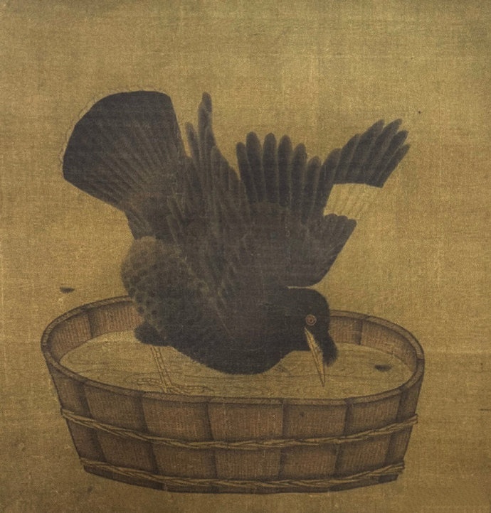 《禽浴图》描绘了八哥洗浴的场景。图中一只八哥立于木盆,盆内清水刚没过两足。八哥双翅舒展,扑打水面,一片羽毛掉落,随水波轻颤,刻画生动,反映出画家细致的观察力和表现力。八哥聪明乖巧、性爱洁净,经常戏水梳洗羽毛,古人亦常以之入画,本图正是这一主题绘画中的佳作。