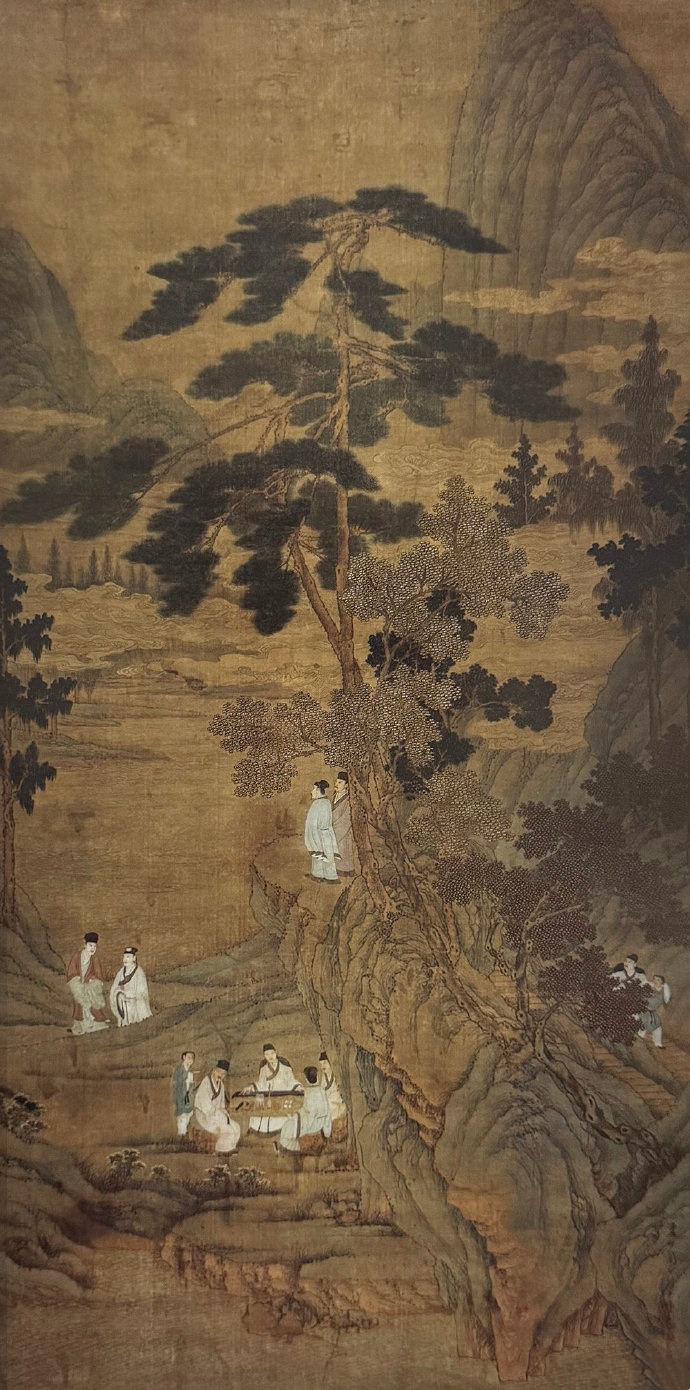 唐代诗人白居易晚年隐居香山(今洛阳龙门附近),并与八位名士结社雅集。明代周臣的《香山九老图》以这一典故为题创作而成,作品章法严谨,笔墨工细。画中青山高峻,溪涧潆洄,林木森茂。九老于山水之间,或抚琴,或论道,或远眺,畅叙幽情,风雅非常。作品在刻画九老雅集场景的同时,也展现了古时文人寄情山水、悠然自得的精神境界。
