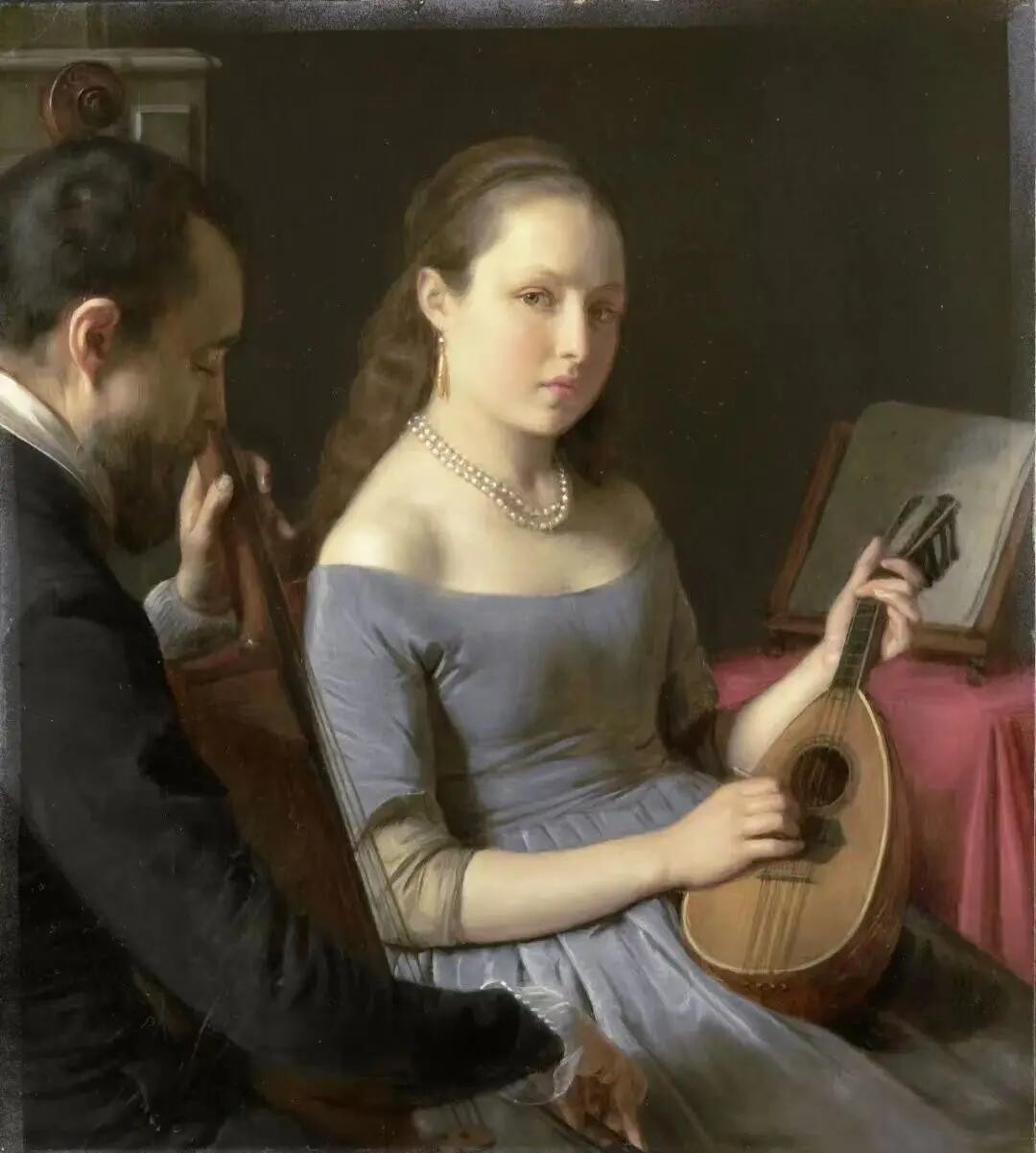 这幅《二重奏》是比利时画家查尔斯·冯·贝弗伦的杰作。画中描绘了室内一角,两位音乐家正在近距离演奏。中央的女音乐家妆容精致,裙子和首饰搭配得当,她手上拨动着琴弦,眼神似乎在盯着观者,或者也可能是作为听众的画家。旁边的男音乐家侧对观者,神情专注。