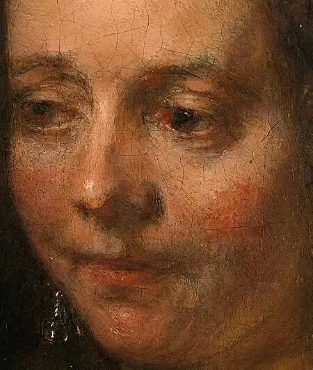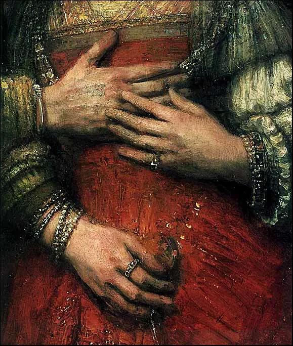 画中男子用左臂环抱女性,而右臂则放在了她的胸前。画作笔触之细腻,体现在了主人公的服装质感、皮肤肌理上。伦勃朗在这里沿用了他擅长的明暗对比,光从上方打下来,突出了这对男女的脸部、手、以及华丽的服装。
