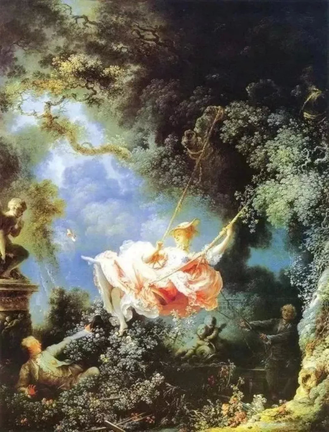 值得一提的是这幅画所属的洛可可画派。洛可可盛行正值路易十五统治时期,此画派逐渐撇弃沉重的宗教题材,转而描写上流社会男女的享乐生活,同时多搭配以自然景色。