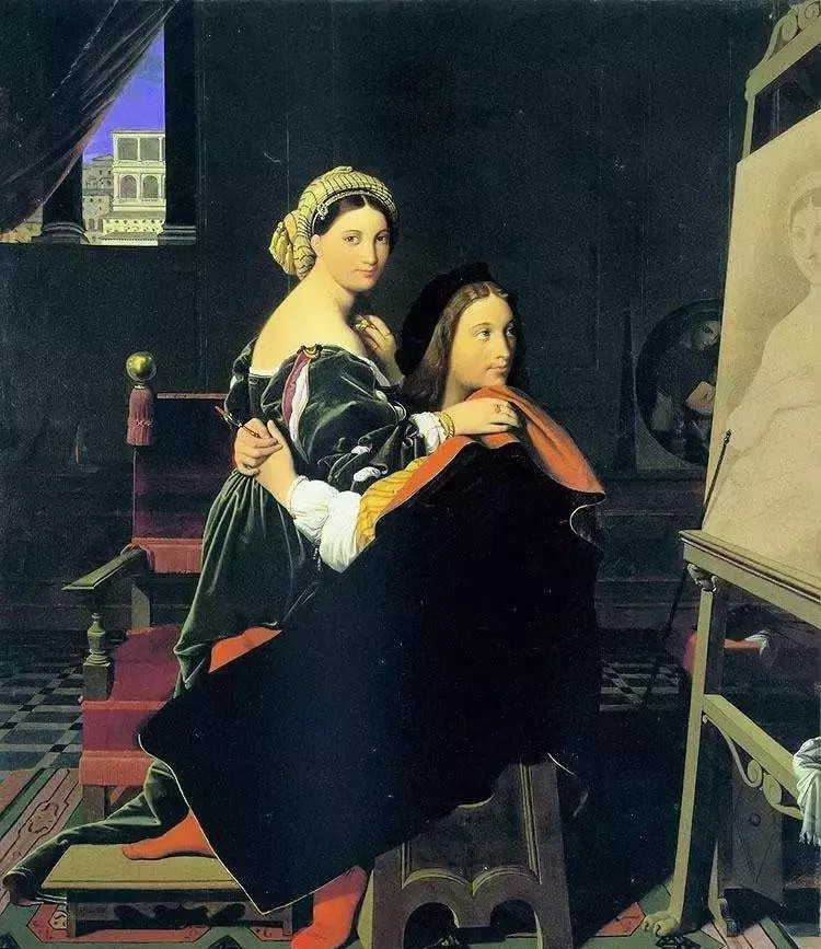 安格尔所处的19世纪前半叶,正是浪漫主义画派盛行时期。早年从巴黎搬到了罗马的安格尔,却选择吸取大量古典主义的精髓。出于对拉斐尔的敬仰,安格尔曾多次临摹他的作品。这张《拉斐尔和弗娜芮纳》也算是安格尔向拉斐尔的致敬。