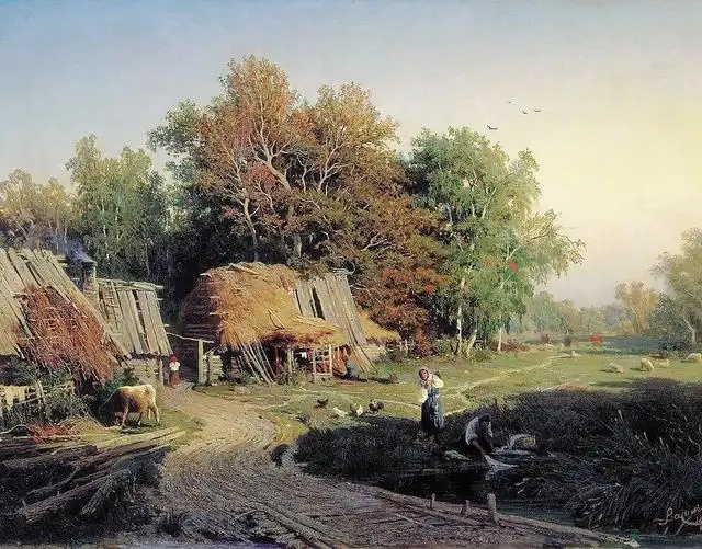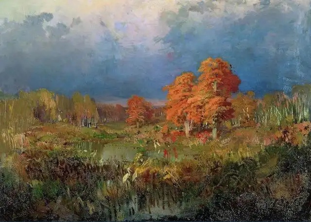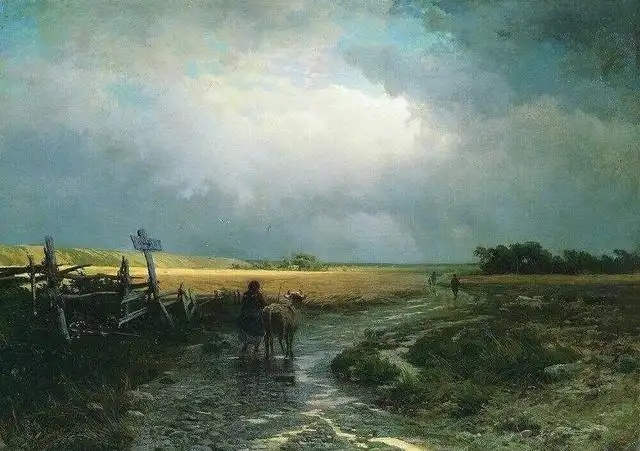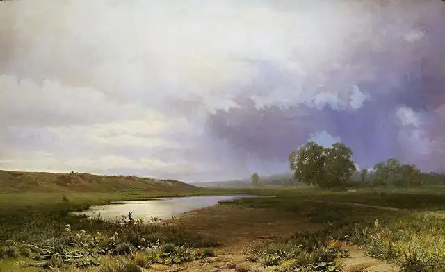 画家力求在画布上表达出大自然再夏日雷雨后常有的那种特殊状态。他巧妙的胜任了这项挑战,在风景中充溢了强烈的情感体验。画中草地经受暴风雨洗礼后,潮湿的花草仍倒向大地,充满动感的天空色彩缤纷,通过描绘这些景色,画家再鲜明的光线对比中构建了画作。漂离的微紫色乌云让人想起了那刚刚爆发的自然力,这乌云被明亮的太阳挤走了去,而这太阳光又让湿草甸子闪闪发光。正式归功于作品的复杂性、色层细致的显微处理和轻盈的淡蓝色薄雾,才营造出了一种浸透了士气和芬芳空气的印象,在画中能感受到画家心中的骚动,他远离故土却创造了她如此充满感情的形象。