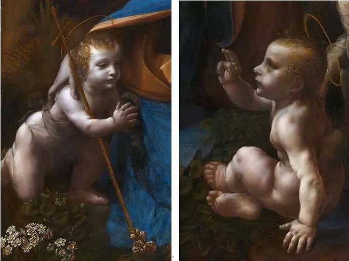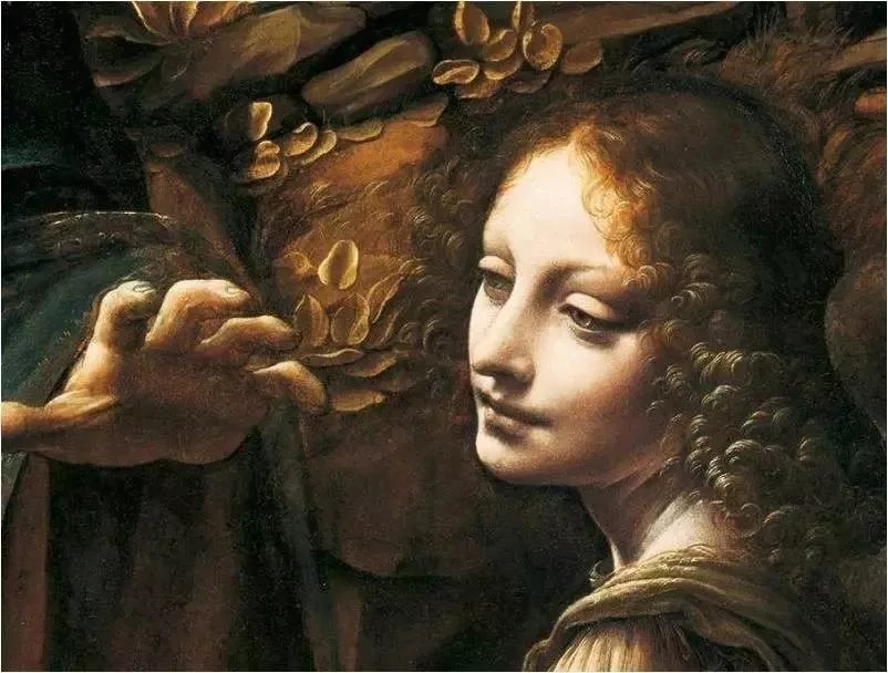 右侧坐在地上的天使乌利那,作为自天而降来到人间的美丽使者,她的形象被刻画得最美,脸上展现着达·芬奇的微笑公式。