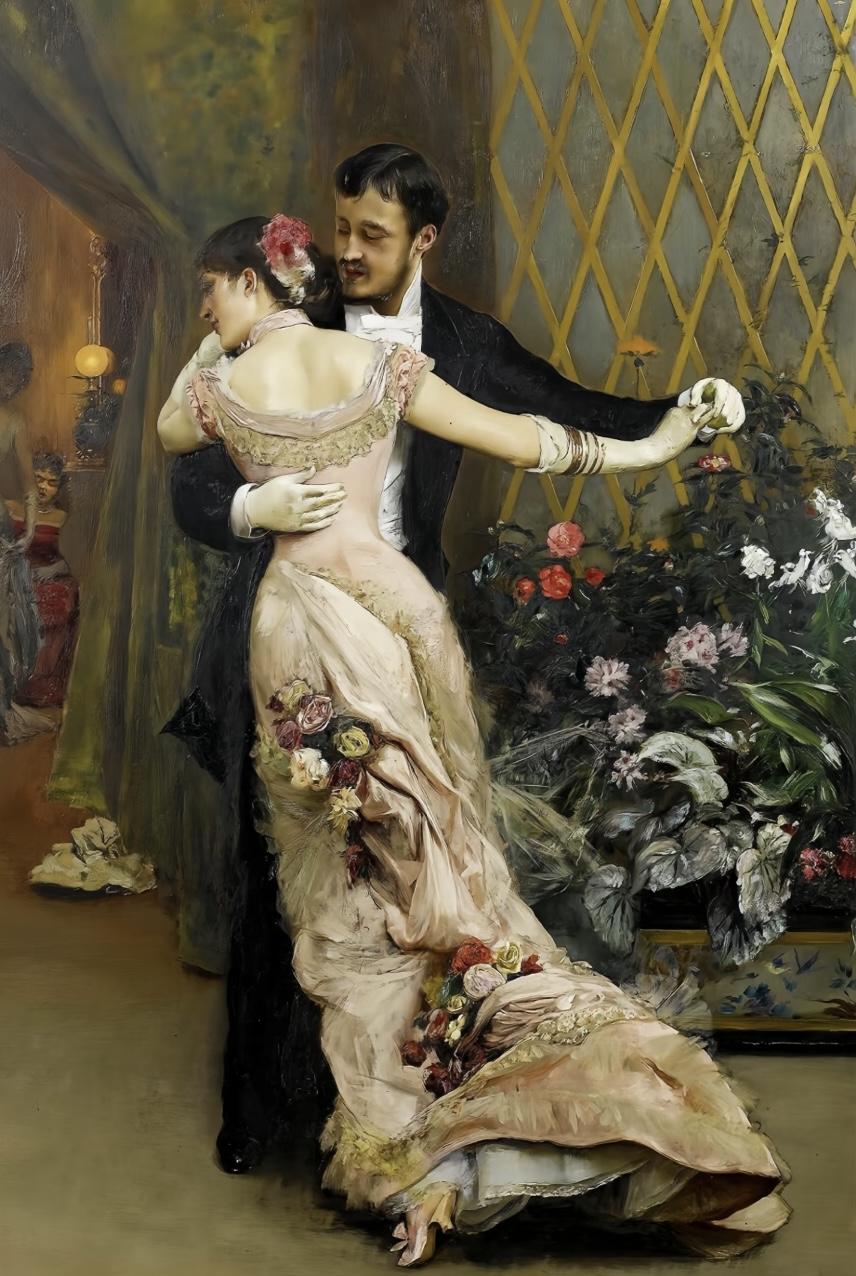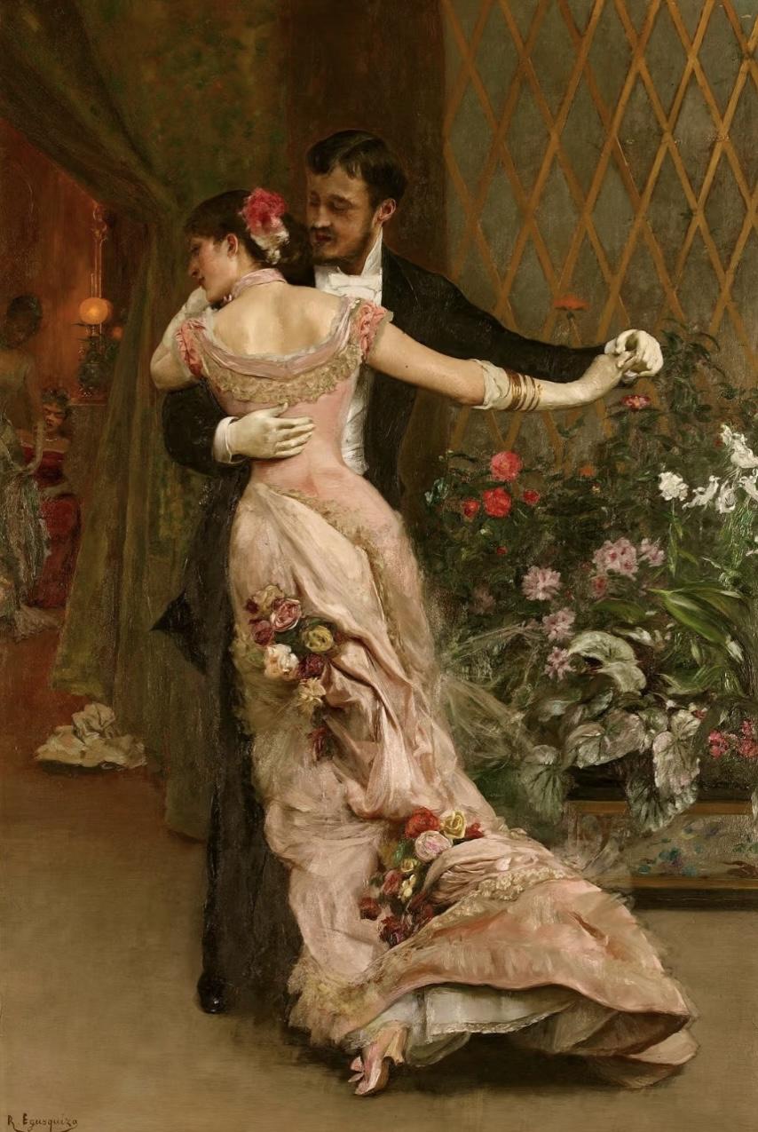 后开襟裙装是19世纪欧洲舞会礼服的典型特征,既符合紧身胸衣塑造的沙漏型轮廓,又通过裸露的背部展现女性曲线美。画家以细腻笔触刻画了蕾丝、缎带等装饰细节,裙摆褶皱的光影处理增强了立体感。