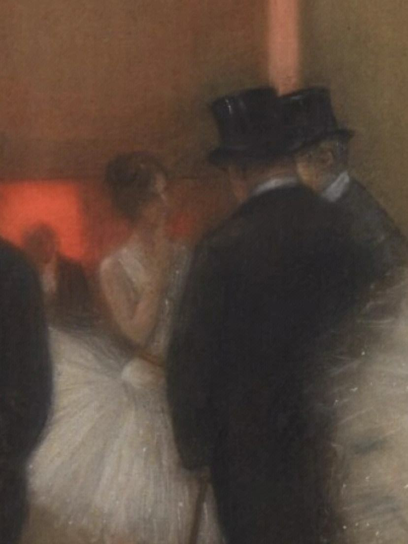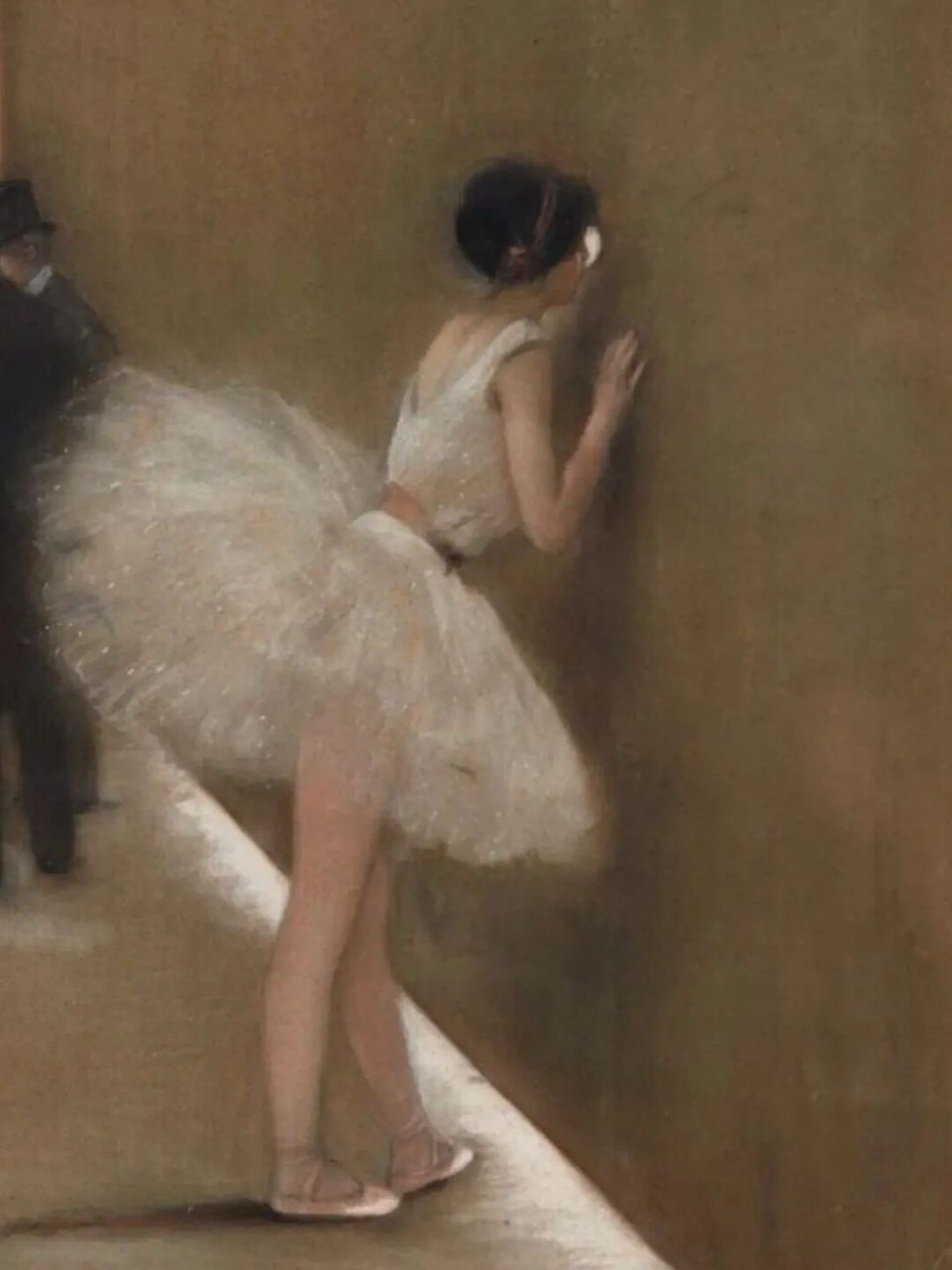 今天介绍的是他的一幅蜡笔画,画中展示了一个温馨的场景:舞蹈演员在演出前窥视观众。她也许在寻找某人,或者只是对观众感到好奇。在这幅画中,可以看到德加对热尔韦在技巧和芭蕾舞主题上的影响(德加也喜欢蜡笔画)。