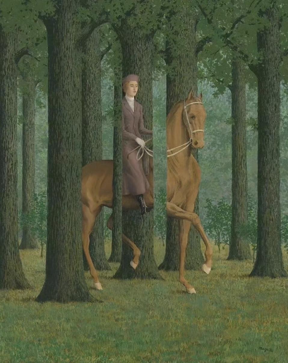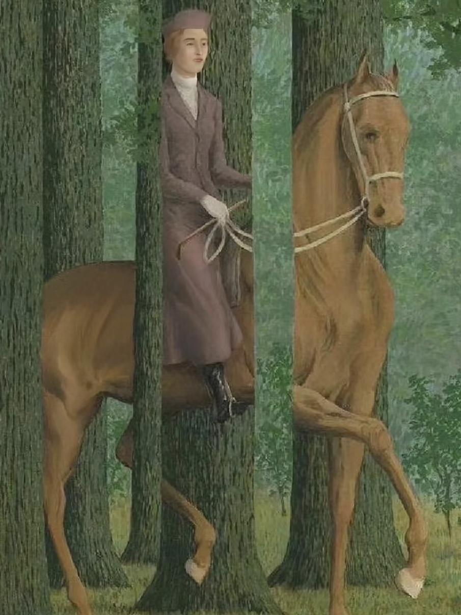 在他的画作中,一位女骑手策马奔腾于林间,巧妙地运用二维平面,展现出三维空间的错觉。这种表现方式,使得每一处细节都充满了多重解读的可能性。是马穿越树林?还是树林穿越马身?