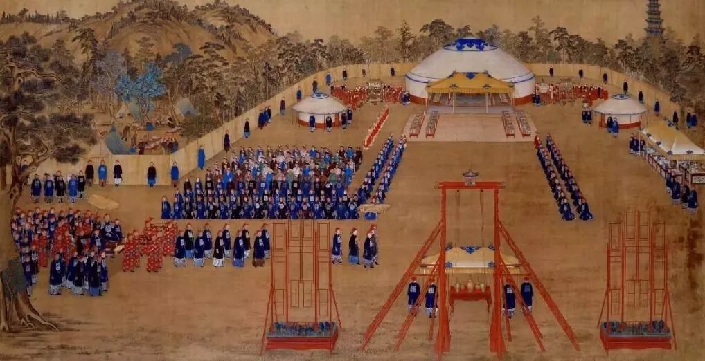 这样的宴会场景,经由清代著名画师郎世宁、王致诚、艾启蒙等人之手,绘制成一幅栩栩如生的《万树园赐宴图》。整幅画绢地缜密,无接缝,系特织宽机画绢,可能是清代杭州织造所织。画面中不仅描绘了避暑山庄的美景,将万树园东西两侧的风光刻画于其中,而且真实反映了清朝对边疆民族地区治理的重视。