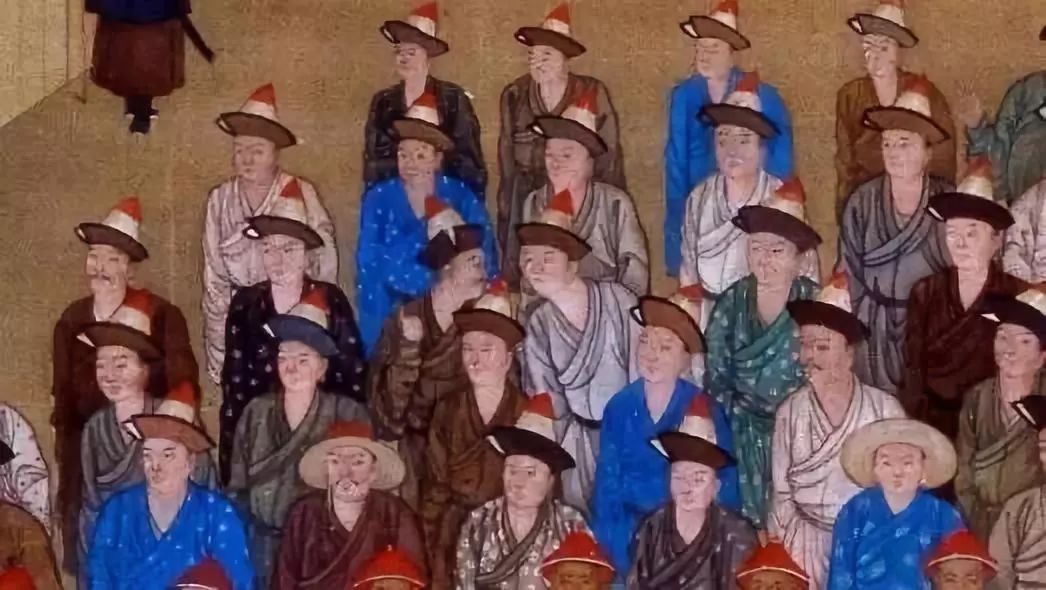 在画面的左下方,乾隆皇帝在文武官员簇拥下,缓缓进入宴会场地。3位前导武官走在队列最前方,其中一人手持云龙黄伞。有两位官员紧随其后,再后面是由二品文武官员组成的两列纵队。紧接着,前后各有8位舆士抬着紫檀雕花步辇,乾隆帝趺坐其上,头戴夏冠,身穿明黄色龙袍,外罩石青色四团龙衮服。舆士身穿小团花红色长袍,以绿带束腰。乾隆皇帝的两侧和后面有手执曲柄华盖、弓矢的扈从、官员、侍卫30余人。园内众人纷纷下跪迎接。宴桌东西两边相对而跪的是亲王至文二品大员,各两排,共54人。西边面向皇帝跪拜的人群中,前三排是亲王、郡王、贝勒、贝子以及文武一二品官员共49人,后五排是入觐的少数民族部落首领及随从共70人。