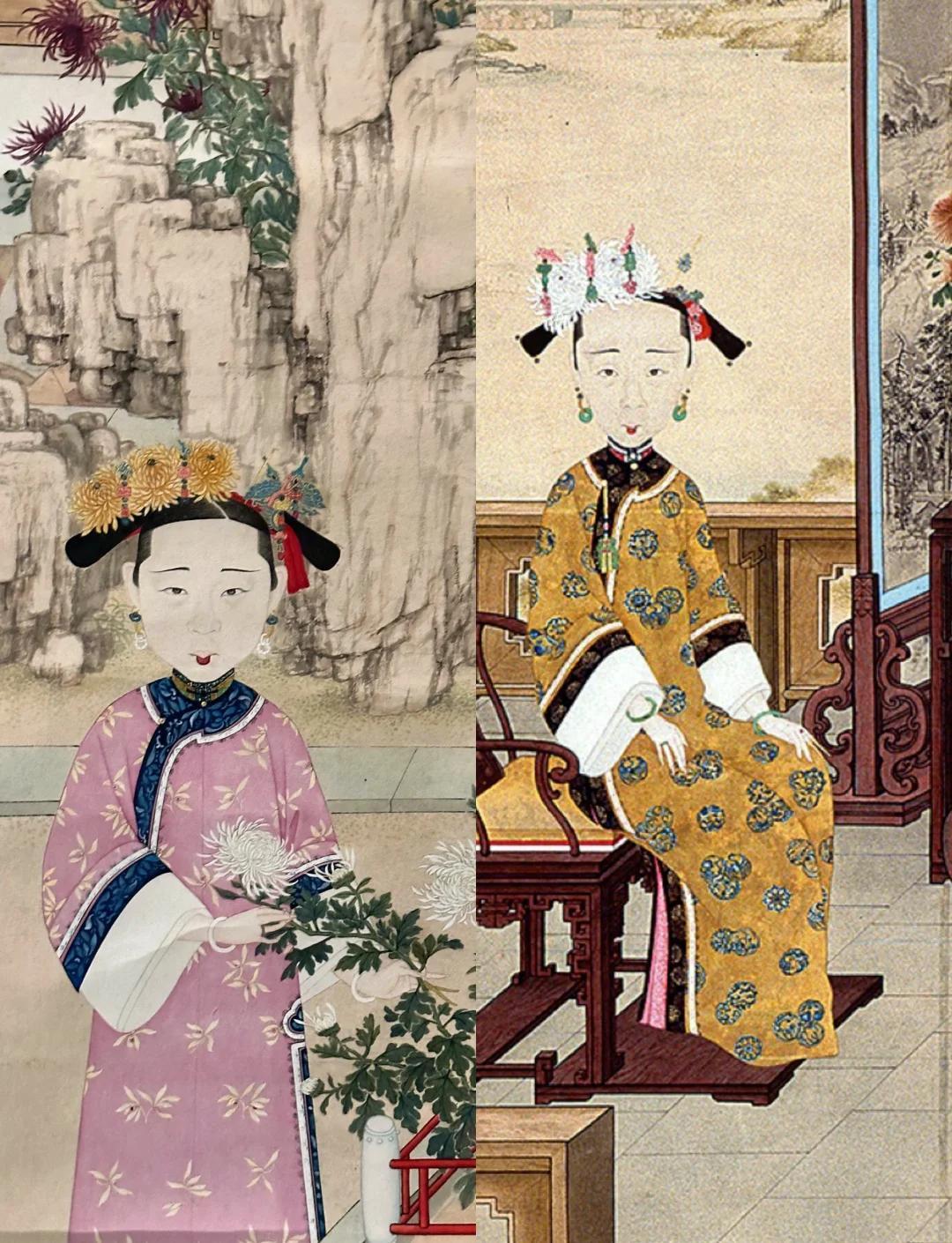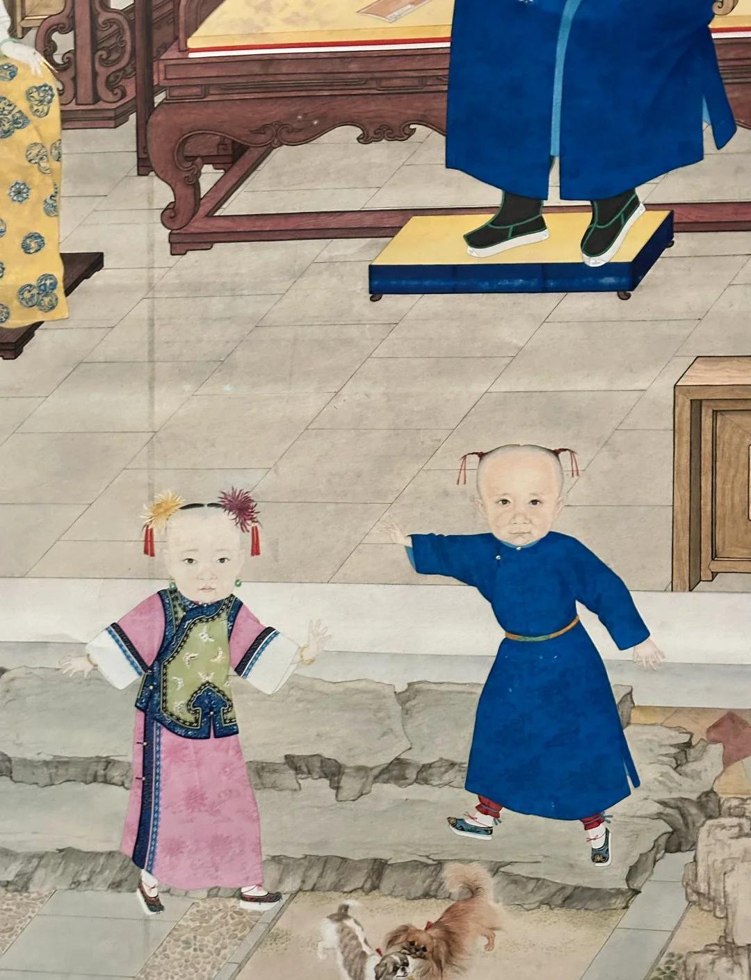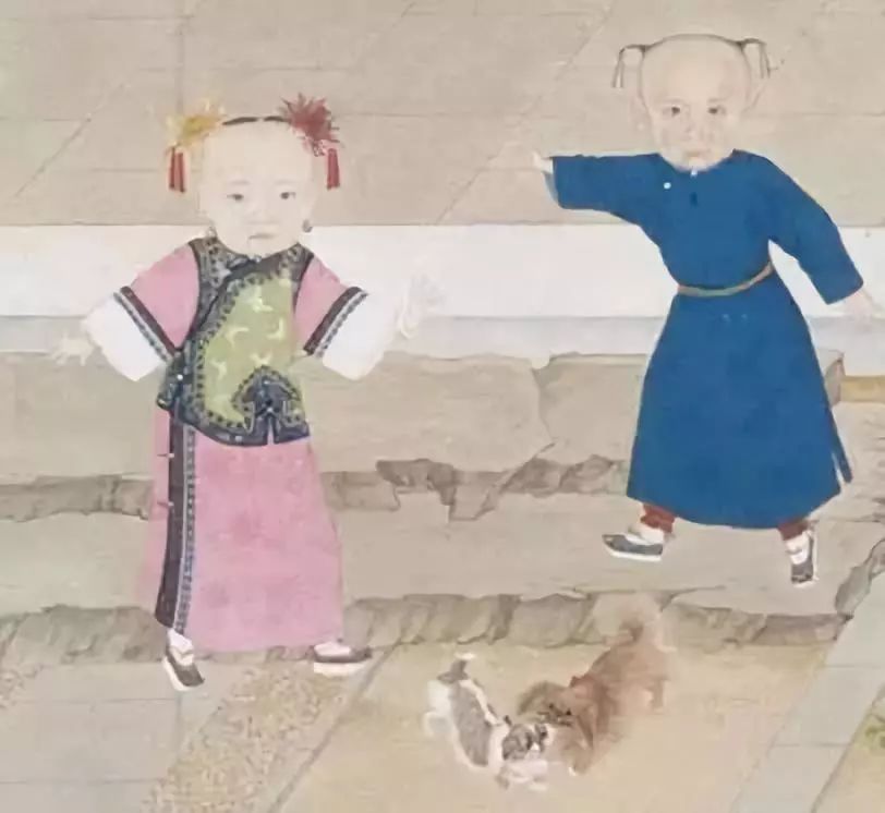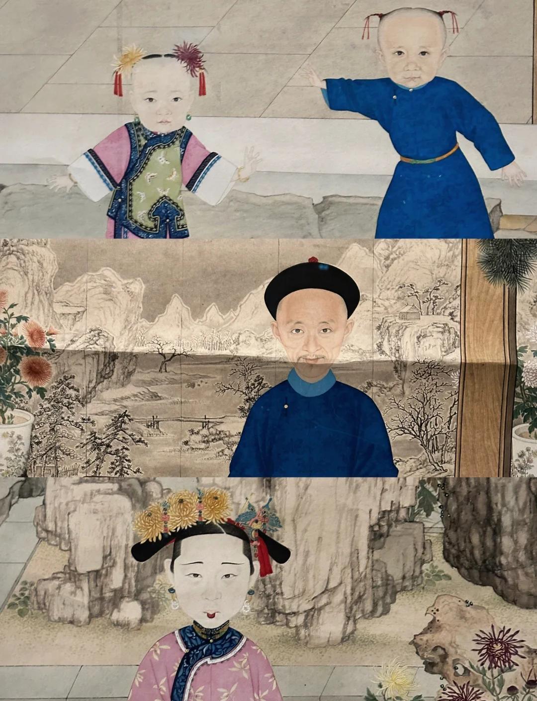 游廊前石阶处,四阿哥奕詝正在和大他一岁的六公主玩耍。两人都只有三四岁,姐弟俩手舞足蹈,叽叽喳喳地逗着两只哈巴狗,还不时咬几句耳朵,憨状可掬。在画面的左前方,是蹒跚学步的六阿哥奕。奕年初刚刚出生,不满一岁,所以年仅二十一岁的生母、静贵妃博尔济吉特氏牵起了小奕的手。显然,奕对身后的小哈巴狗更感兴趣,试图挣脱母亲的牵引。而在画面最左边、奕母子身侧的是三公主。当年三公主已经九岁了,按宫廷的要求,这个年纪的公主不再是一个小孩子,要开始女德培训了。所以,三公主不苟言笑,手托茶盘,准备往游廊向父母敬茶。画面右侧有一位在花池边赏菊的女子,应该是与静贵妃身份地位、年龄相仿的某位皇妃,因为旻宁的宠爱才出现在画中。
