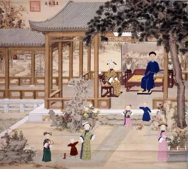 《喜溢秋庭》应运而生。画的内容是一个枫叶泛红、菊花盛开的秋日,宫苑溪流潺潺、松翠依旧,道光皇帝旻宁闲坐在游廊之中,端详着子女嬉戏,享受难得的阖家团聚的时光。