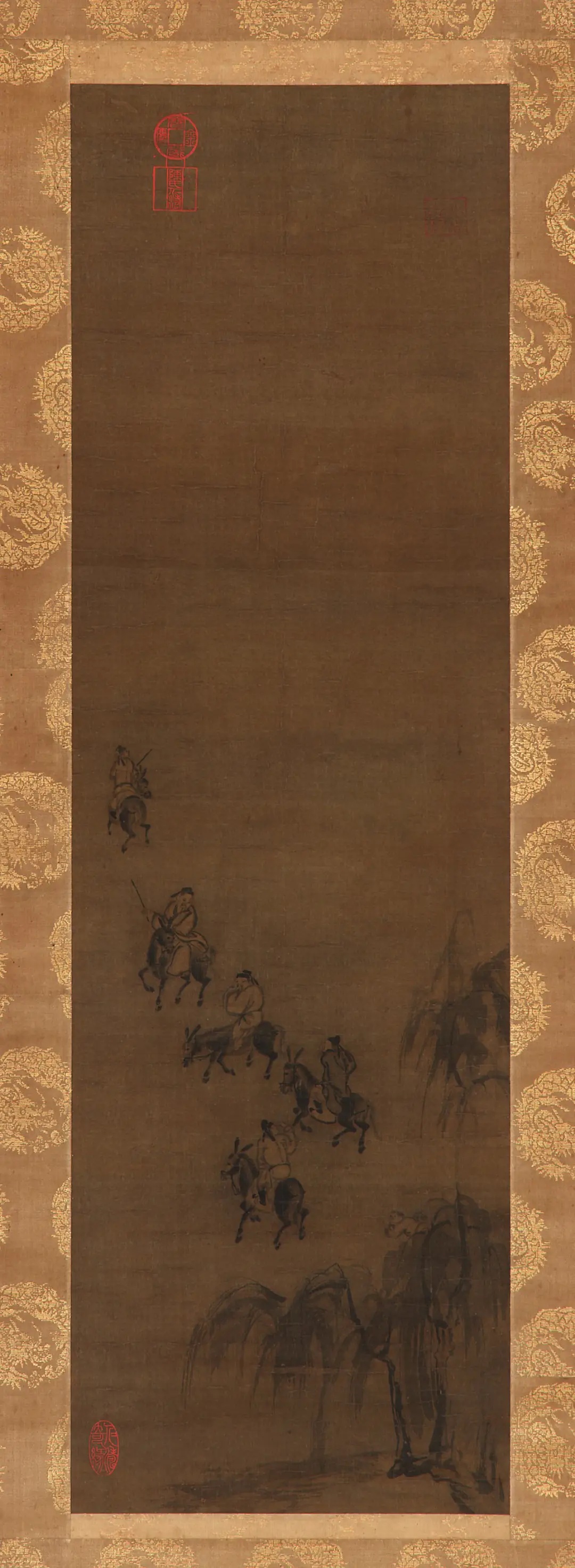 南宋 马公显 骑驴郊游图]尺寸:87.6*26.9cm弗利尔美术馆藏。绘一行五人骑驴出村口的情景,树木和近景坡石粗笔率意挥写,给人以水墨淋漓之感。构图是比较典型的边角方式,人物和景物主要集中在下方,与上方的空白形成虚实相生的对比。马公显,马远伯父,马兴祖之子,在人物、山水、花鸟画上无一不工。