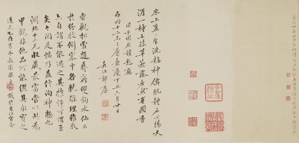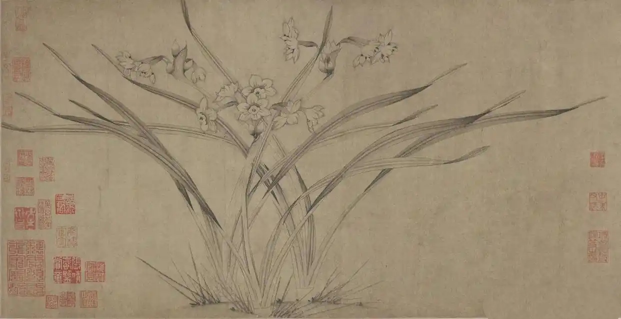 《水仙图》纸本,水墨,31.5*76.6CM,弗瑞尔美术馆藏。绘水仙一丛,细叶舒展自然,枝茎上花儿绽放,香气扑鼻,花下小草丛生。此幅与天津博物馆藏6.74米长的《水仙图》非常相似,但土坡和小草绘法略有差异,天博的显得更为随意和舒展。
