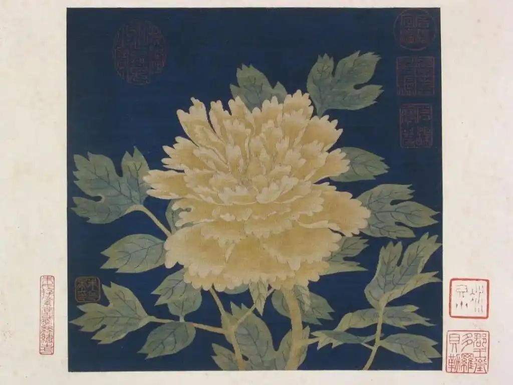 以花鸟画为稿本缂织蓝色地,凌空式构图黄色牡丹一枝。从花心处向外逐层晕染色彩,边缘处用白色提亮,与宋代马远绘白蔷薇图中的施色方法一致。在宋代“格物致知”思潮影响下,画家甚至亲手栽培以求将花卉描绘得精妙甚微,“牡丹”在人的智慧与创造下“独钟其美而见幸于人焉”。