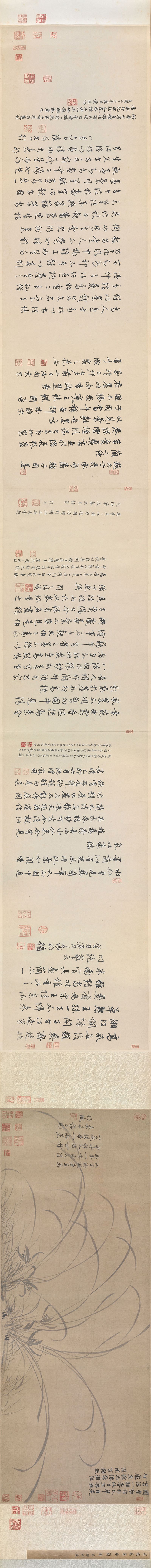 此图绘墨兰两丛,生于草地上;兰花盛开,如彩蝶翩翩起舞。兰叶柔美舒放,清雅俊爽。全图用笔劲利,笔意绵绵,气脉不断,是赵氏画兰的代表作。