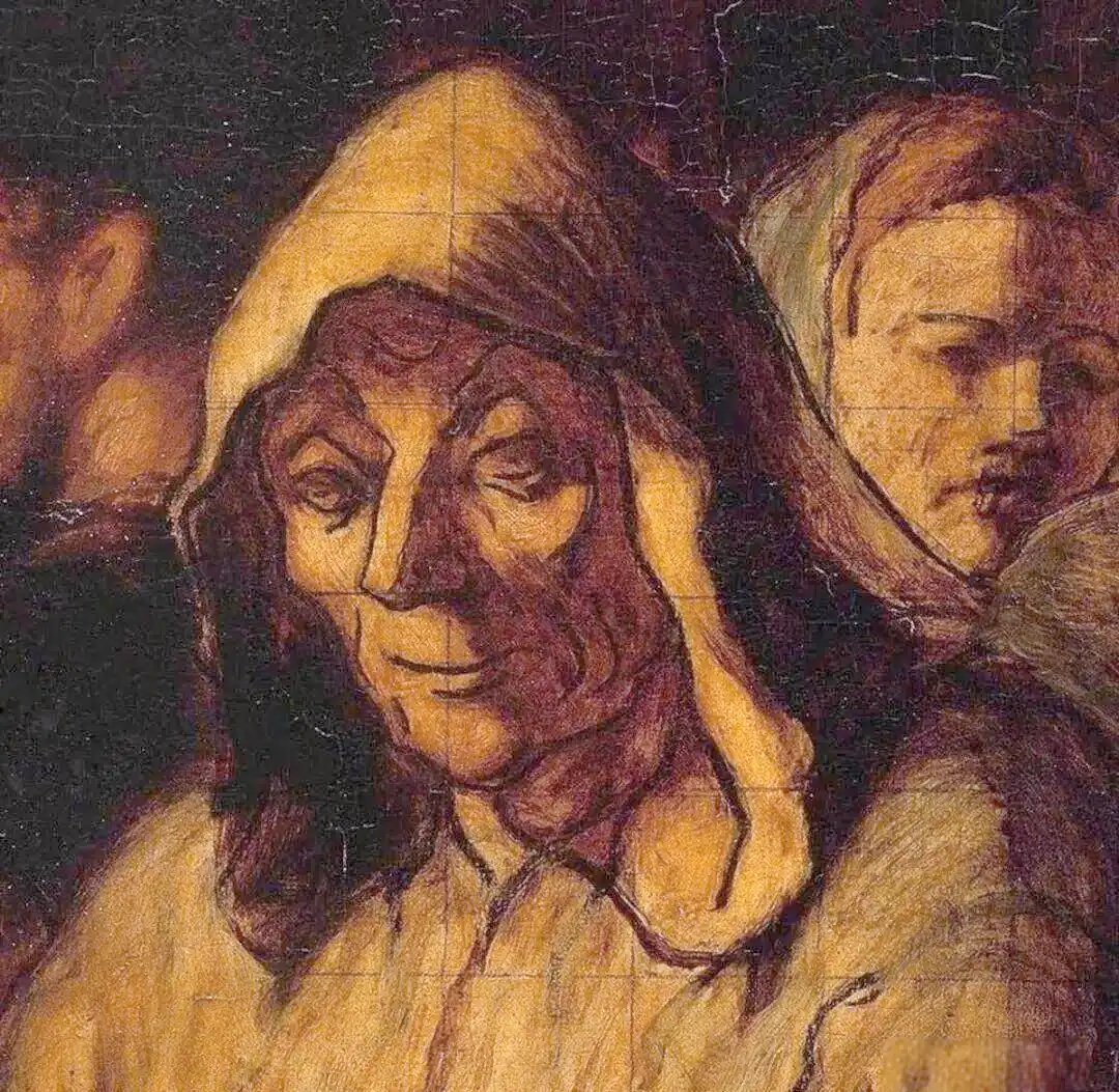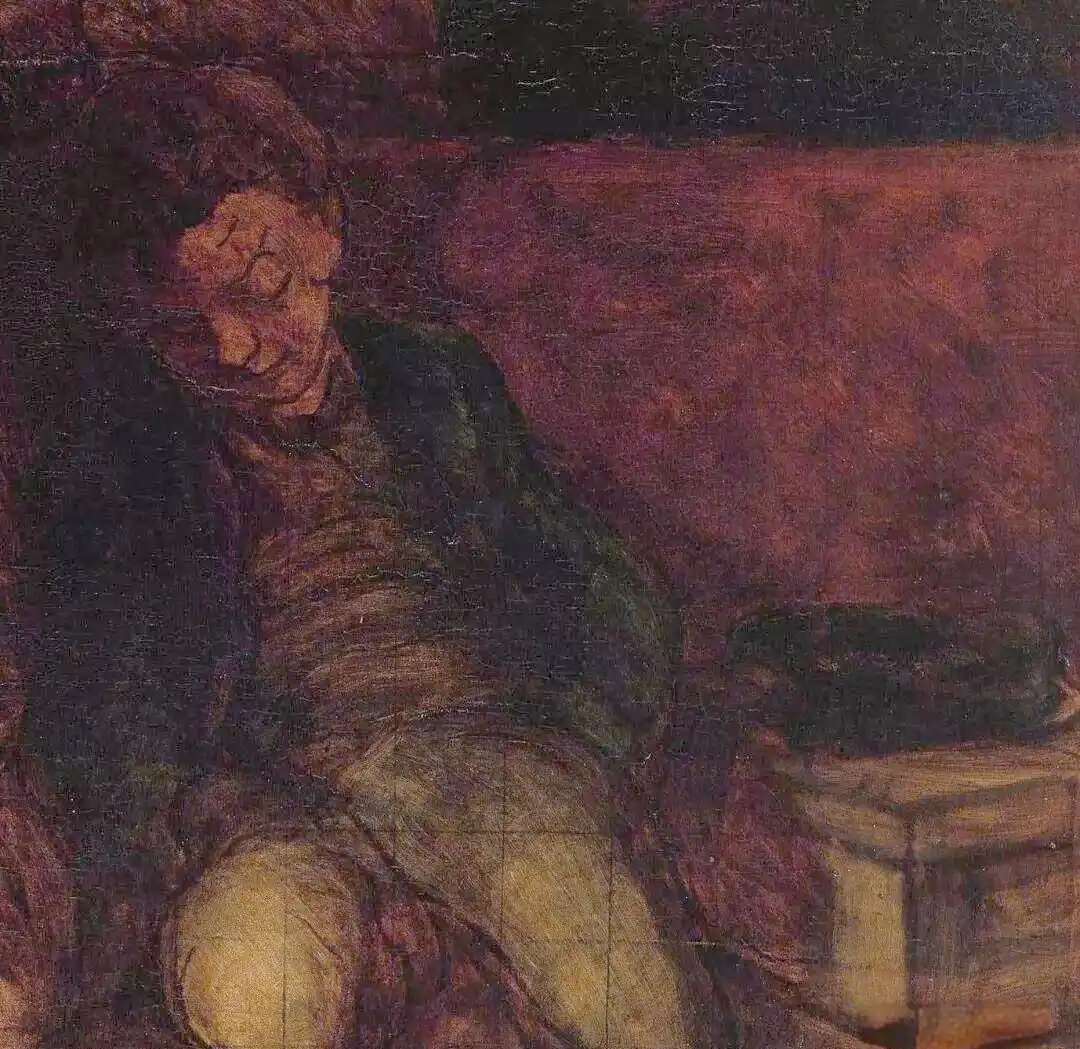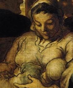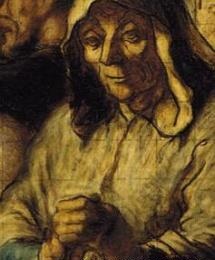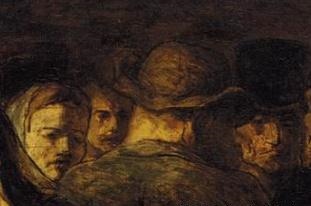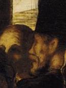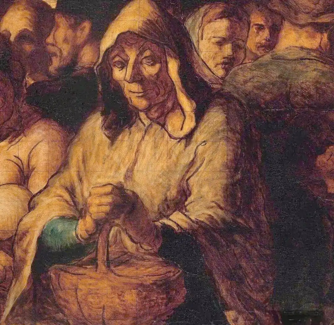 画面以棕色和褐色为主色调,红黄两色贯穿其中,沉闷压抑的气氛扑面而来。怀抱孩子的年轻母亲、饱经风霜的老妇人、涉世未深的少年与背后带着礼帽的男人,似是一个时代社会发展的缩影。18到19世纪的法国在动荡与革命的徘徊中前进,资本主义甚嚣尘上,社会风气就是“一切向钱看”,人民受到残酷的剥削压迫,处在水深火热之中,杜米埃用《三等车厢》让我们重新审视了当时社会的等级制度和社会不公。