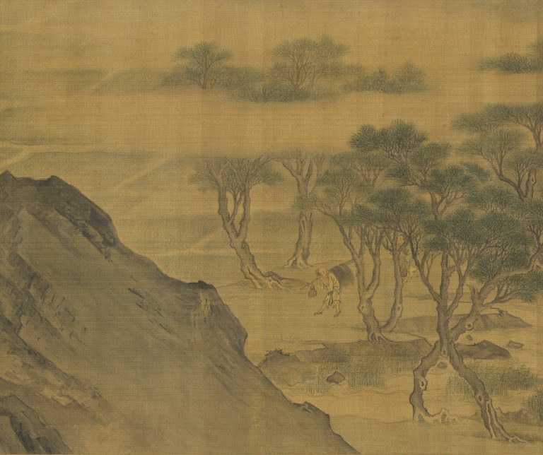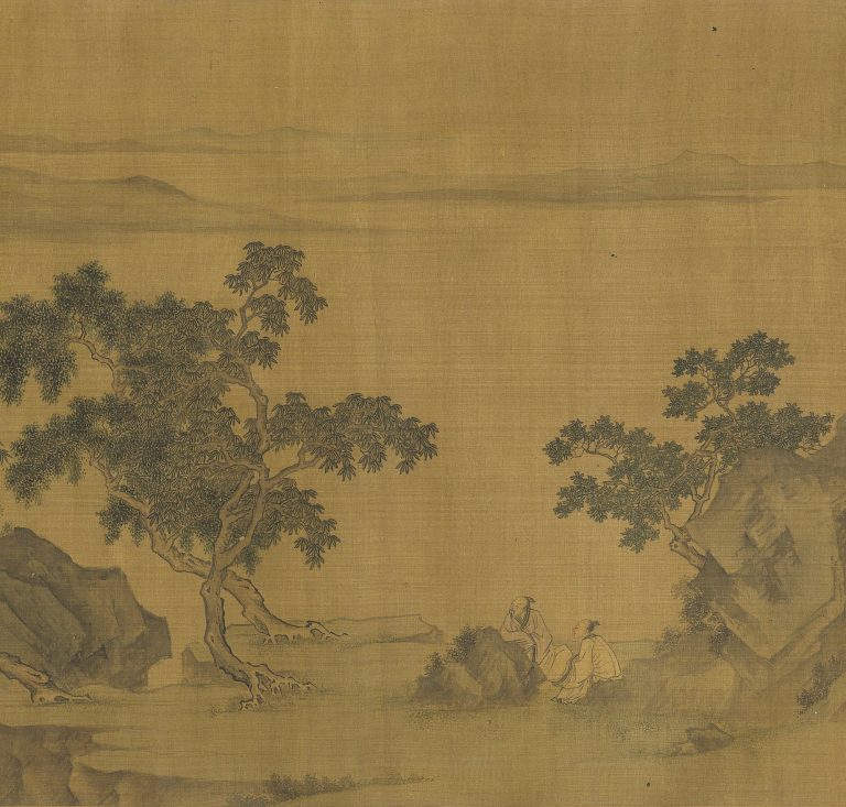 本卷以平远的布局为背景,卷首是两位高士晏坐在山石间,表情轻松愉悦,好像正在随意闲聊。接着视角深入山林,穿过山间的亭子和跨过溪流的小桥,一个宅子的景象映入眼帘。