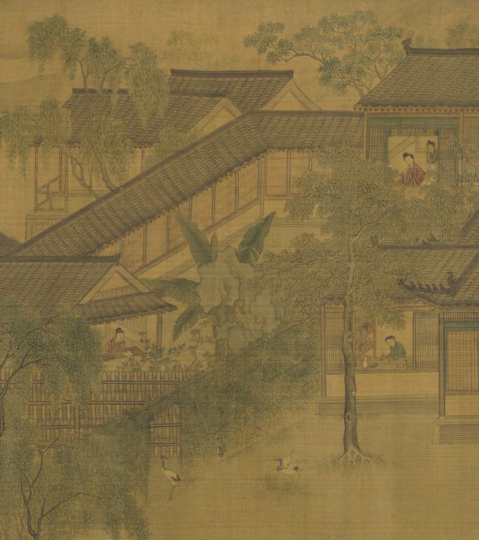 庭院中有两只仙鹤,前厅里有一位文士正在抚琴,客人正微笑着聆听音乐。在宅子的左侧,一个人正坐在窗前读书,窗外几朵花盛开在枝头上,仿佛能闻到阵阵幽香。