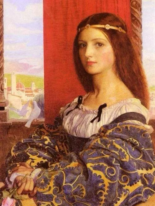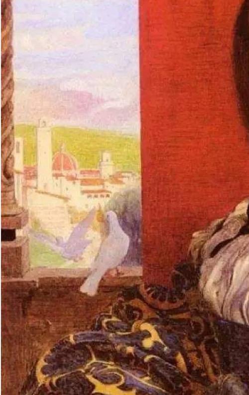 评述:第一眼便被这位女子的美貌所惊艳,曲眉丰颊 ,剪水双瞳,肤如凝脂,玉指如葱,正如她手中的玫瑰一般娇艳迷人。公爵夫人身着印有宫廷花纹的衣服,头戴发带,打扮并没有很浮夸,但却格外端庄。窗台上两只卿卿我我的白鸽,似乎在暗示公爵夫人幸福美好的婚姻生活。从窗户眺望过去,是一处豪华庄园,证明了这位美女养尊处优的生活状态。