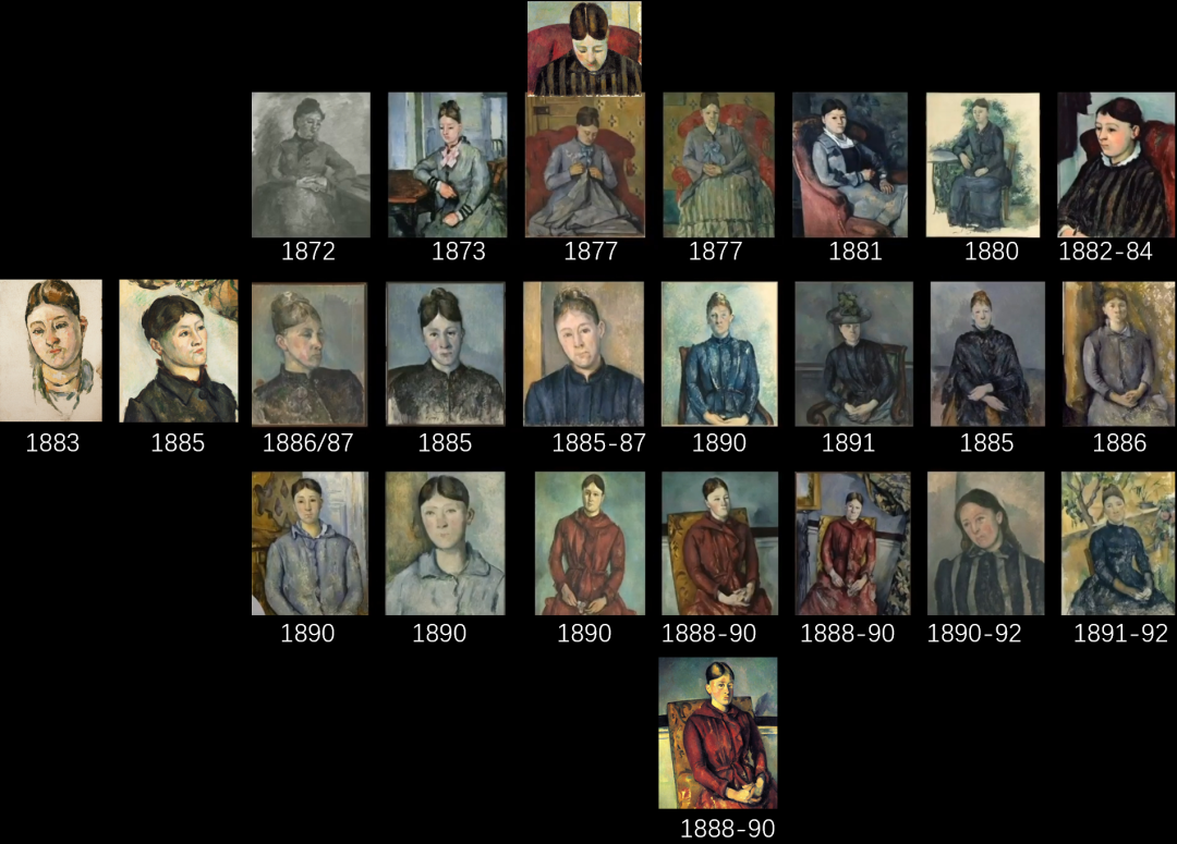 塞尚所作的夫人肖像跨越了20年的时间,在每一张作品中她都有所不同。虽然她总是坐着,但她时而像是一位忧郁的圣母,时而像一位严厉的校长,时而像是一个胸部平坦的雌雄莫辩的男孩。大都会博物馆的展览使四幅戏剧性的画作重新聚到了一起,俗称为“穿红裙的塞尚夫人”。